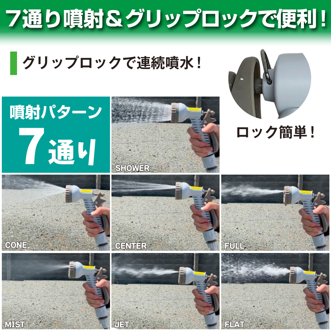 用途に合わせてシャワー (外)・ジェット・ミスト・ストレート・広拡散・シャワー (中)・横拡散の7種類の散水パターンに切替可能!