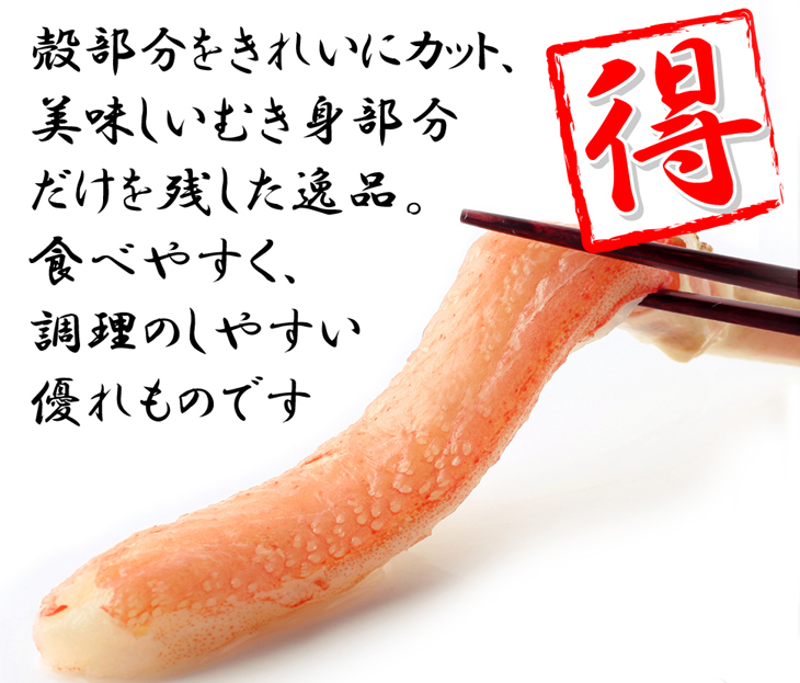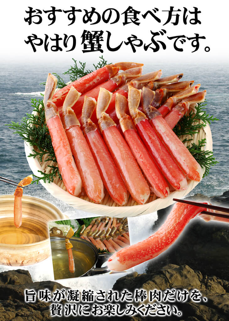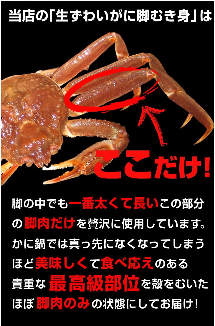 生食できるほど鮮度が高く、最も美味しい一番脚肉を特別価格で。殻むきの手間が不要で、本ずわいの深い甘みととろける食感を、そのまま刺し身や蟹しゃぶでご堪能ください。