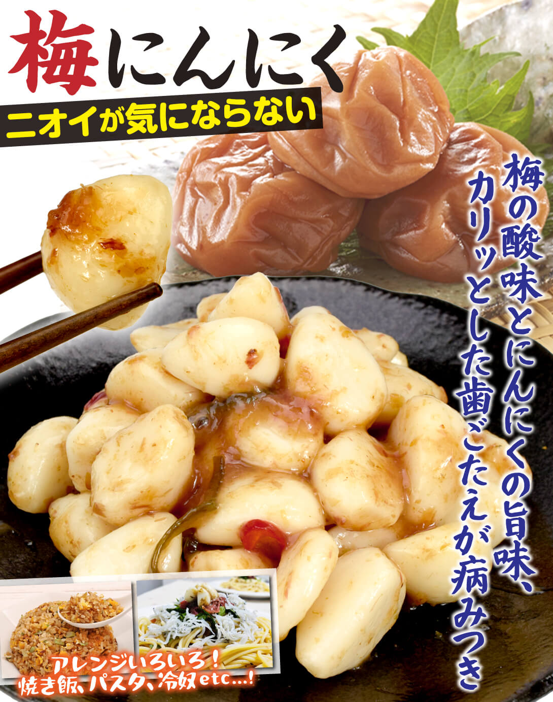 ●商品情報:にんにくのカリッとした歯ごたえ、さっぱりとした梅の酸味と、にんにくの旨味が絶妙にマッチした一品です。良質の梅肉と本かつお、北海道産の昆布を加え、甘酸っぱく旨味があり、気になる匂いを大幅に取り除き食べやすく仕上げているため、にんにくが苦手な方にもおすすめ!ご飯のお供はもちろん、お茶漬けや冷奴、おつまみにもぴったり。あと一品欲しい時や、さっぱりしたものが食べたい時にも大活躍♪毎日の食卓に取り入れやすい、やみつきになる美味しさをぜひご賞味ください。