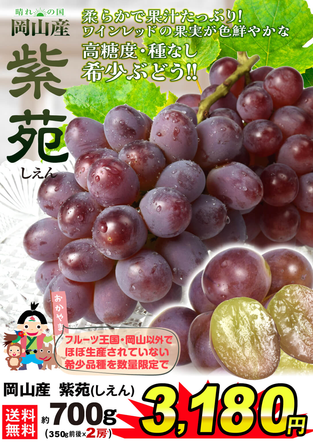 ぶどう 約700g 岡山産 紫苑(しえん) 赤葡萄 (350g前後×2房)種なしブドウ 高糖度 送料無料 食品