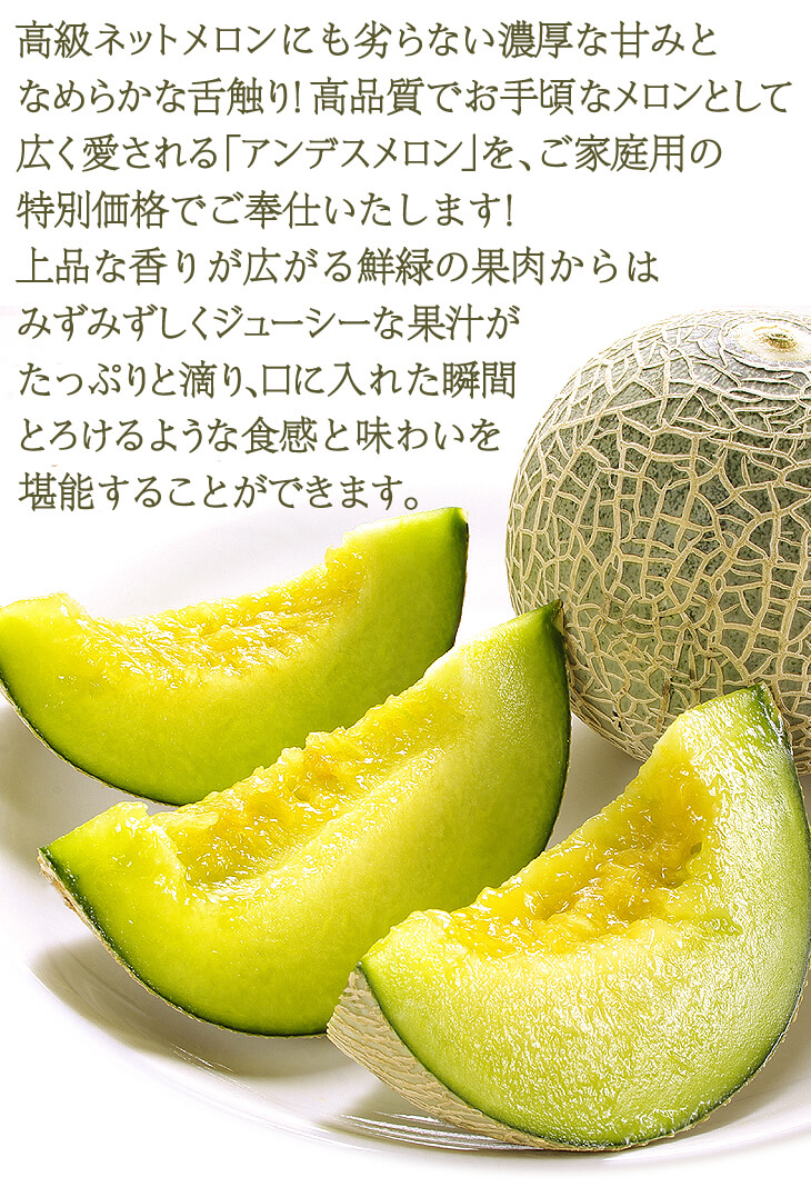 ●商品情報:高級ネットメロンにも劣らない濃厚な甘味と上品な香り、果汁に満ちた滑らかな舌触り!高品質なのにお手頃価格な、ご家庭用メロン。