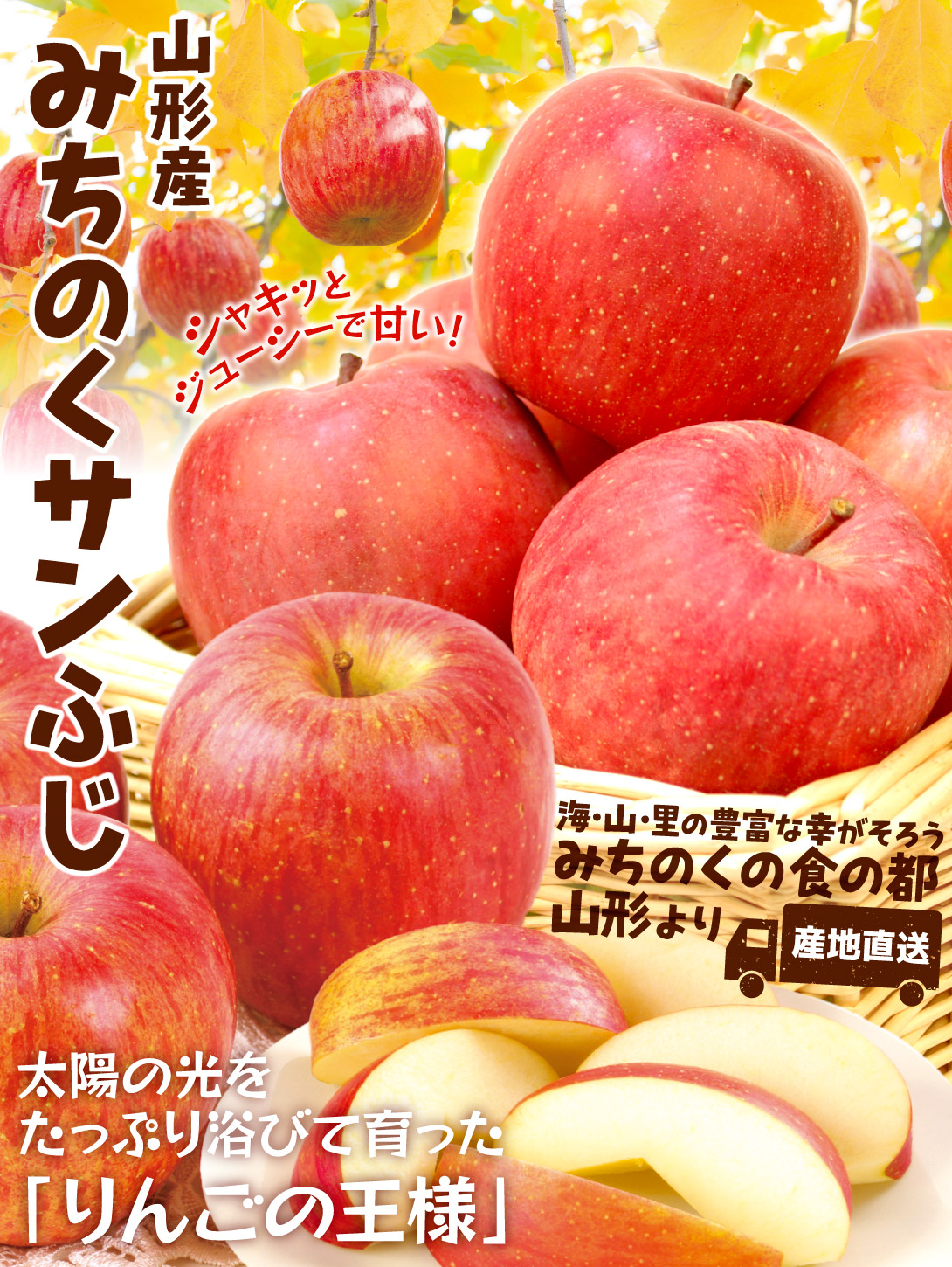 「みちのくの食の都」山形県より、絶品りんごをとれたて直送!旨味がぎゅっと凝縮されたジューシーで味わいの深い逸品を、ご家庭用特価で大奉仕!