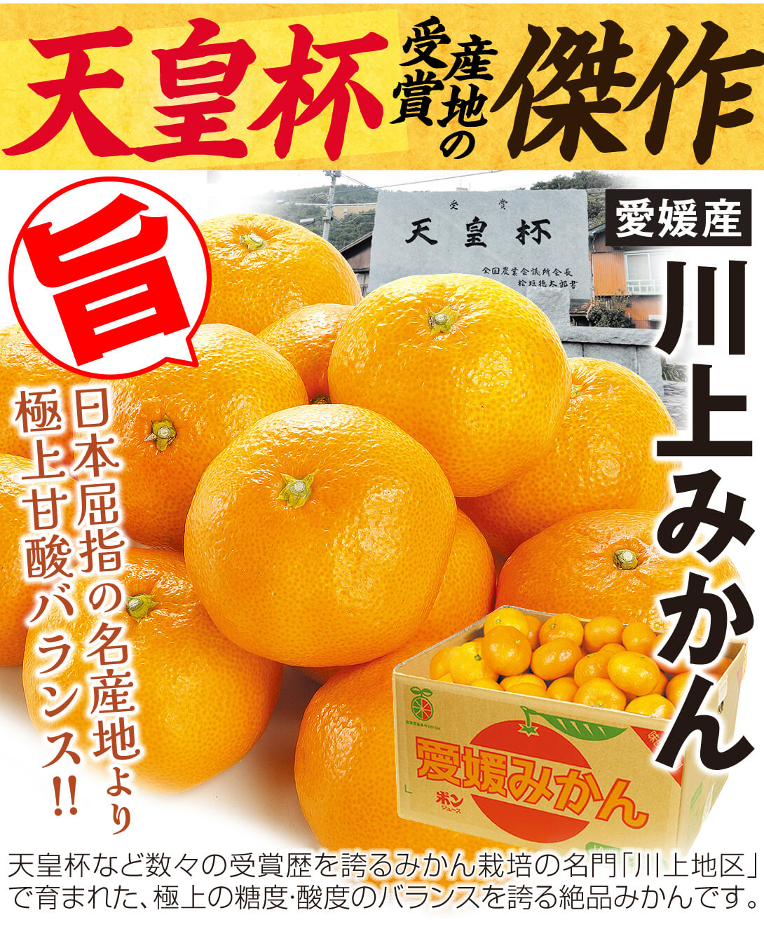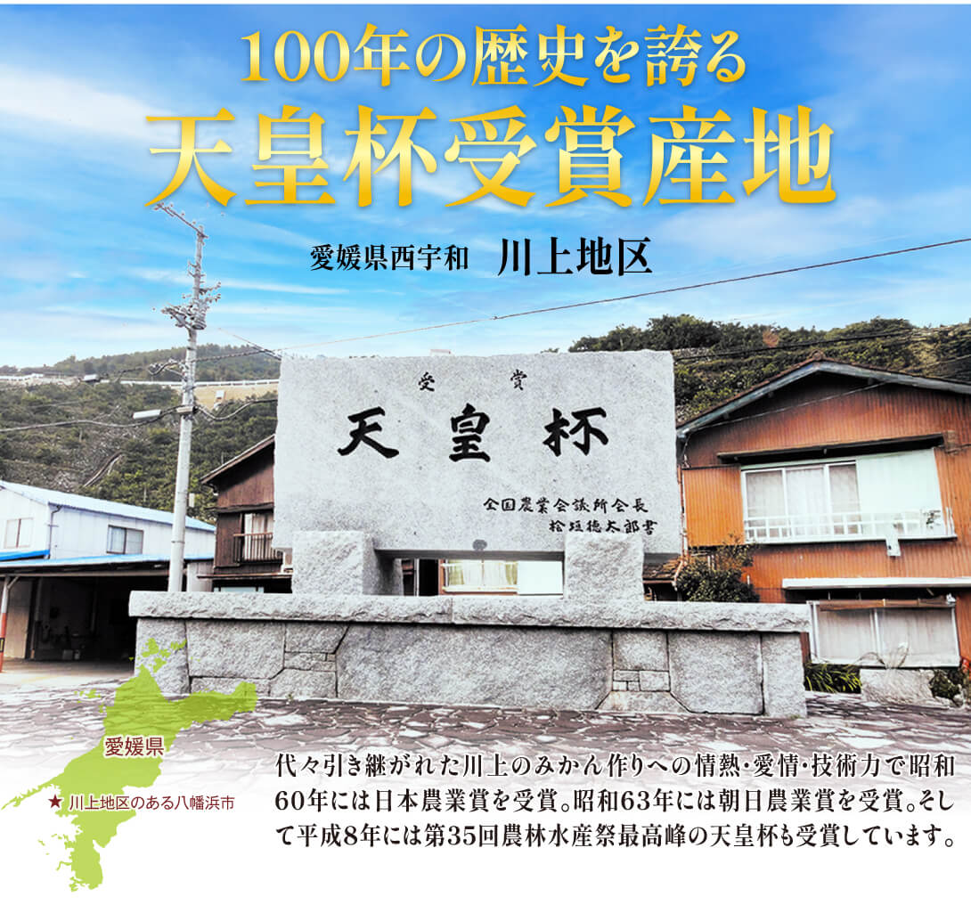 ●商品情報:天皇杯など数々の受賞歴を誇るみかんの名産地「川上地区」で育まれた、糖度・酸度のバランスが良い絶品みかんです。