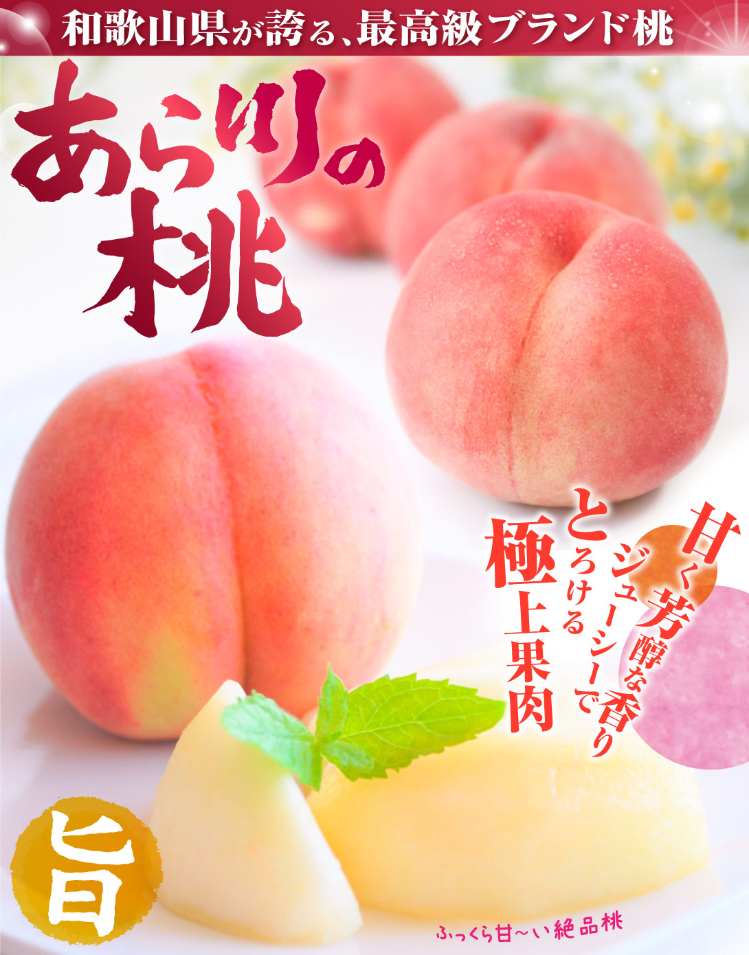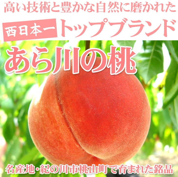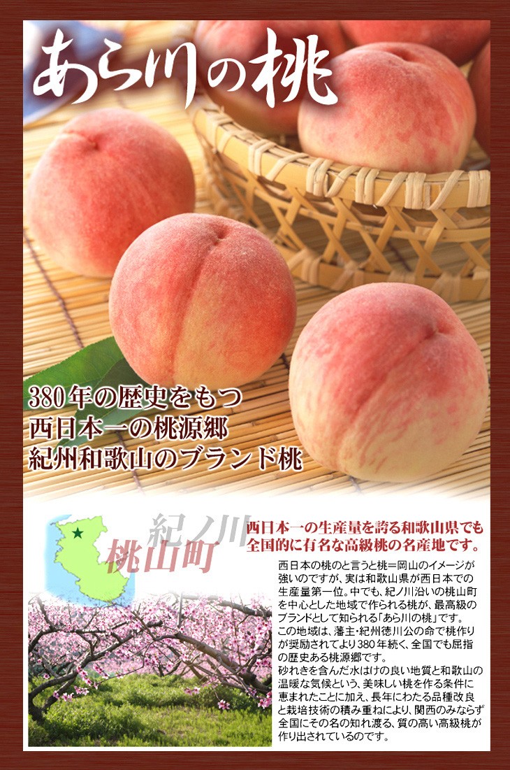 ●商品情報:約240年以上の歴史を持つ桃の名産地・紀の川市桃山町の「あら川の桃」は、品質が高く上品な香りと抜群の甘味・果汁があふれる“西日本一”と言っても過言ではない最高級ブランド桃です。