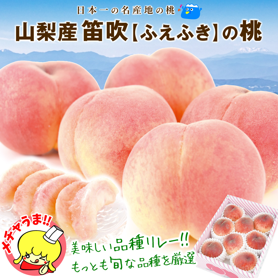 ●商品情報:富士山を臨み山々に囲まれた甲府盆地の、朝夕の寒暖差と水はけの良い土壌、燦々と降り注ぐ太陽が、甘味がぎゅっと凝縮された極上の桃を育みます。時期によって異なる旬の品種は、どの桃も美味しく、魅力がいっぱい!