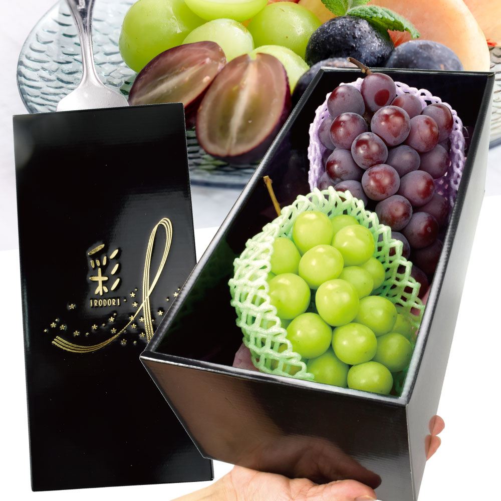 ●商品情報:爽やかな甘味の「シャインマスカット」と、濃厚・芳醇な甘みの黒ぶどう「ピオーネ」。味わいの違いを楽しめる2種のぶどうを豪華化粧箱でお届け!