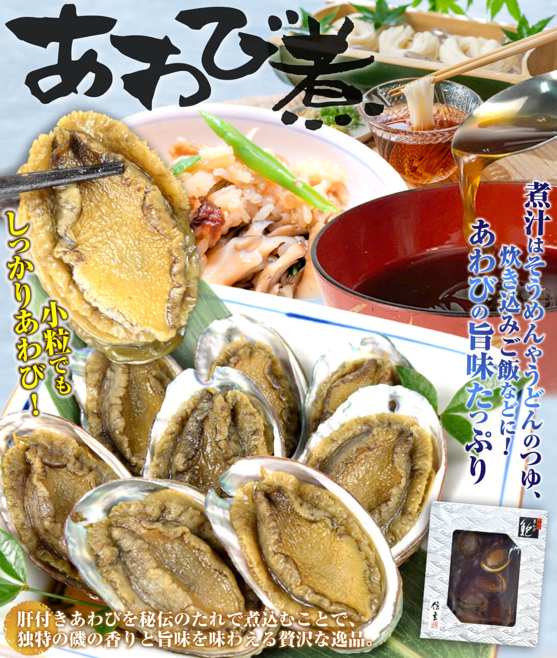 ●商品情報:あわび煮貝の老舗より。小振りですが身の締まった蝦夷あわびを、殻つきのまま柔らかく煮上げました。煮汁は炊き込みご飯などに!