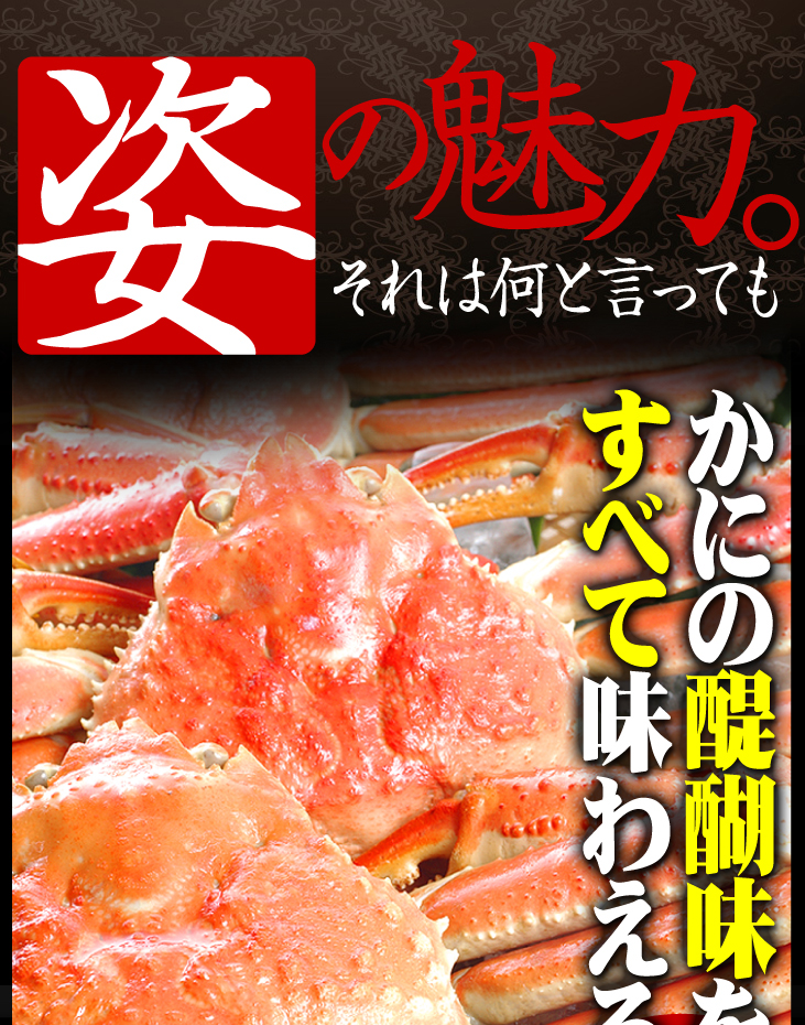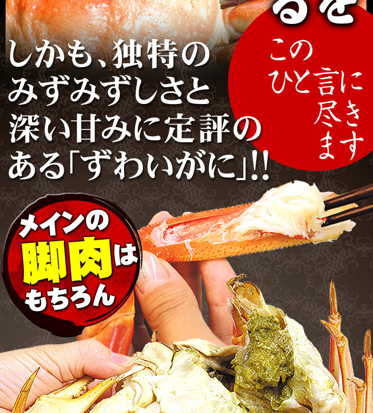 ●商品情報:大きく新鮮なずわいがにを、丸まる一尾塩茹でしました。繊細でみずみずしい甘みの脚身から、ぷりっと肉感の良い爪、旨み溢れるかに味噌まで、ずわいがにの魅力を堪能できる贅沢な一品です。