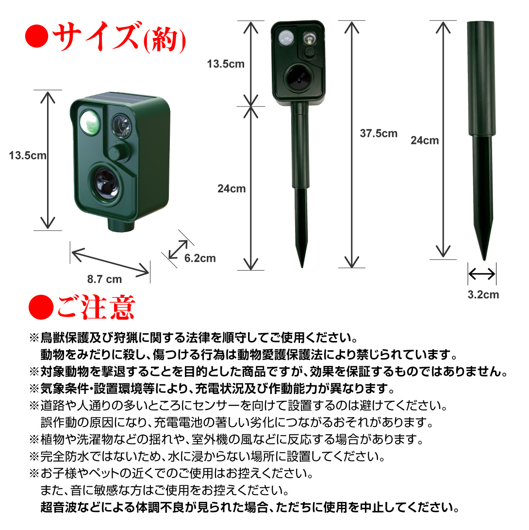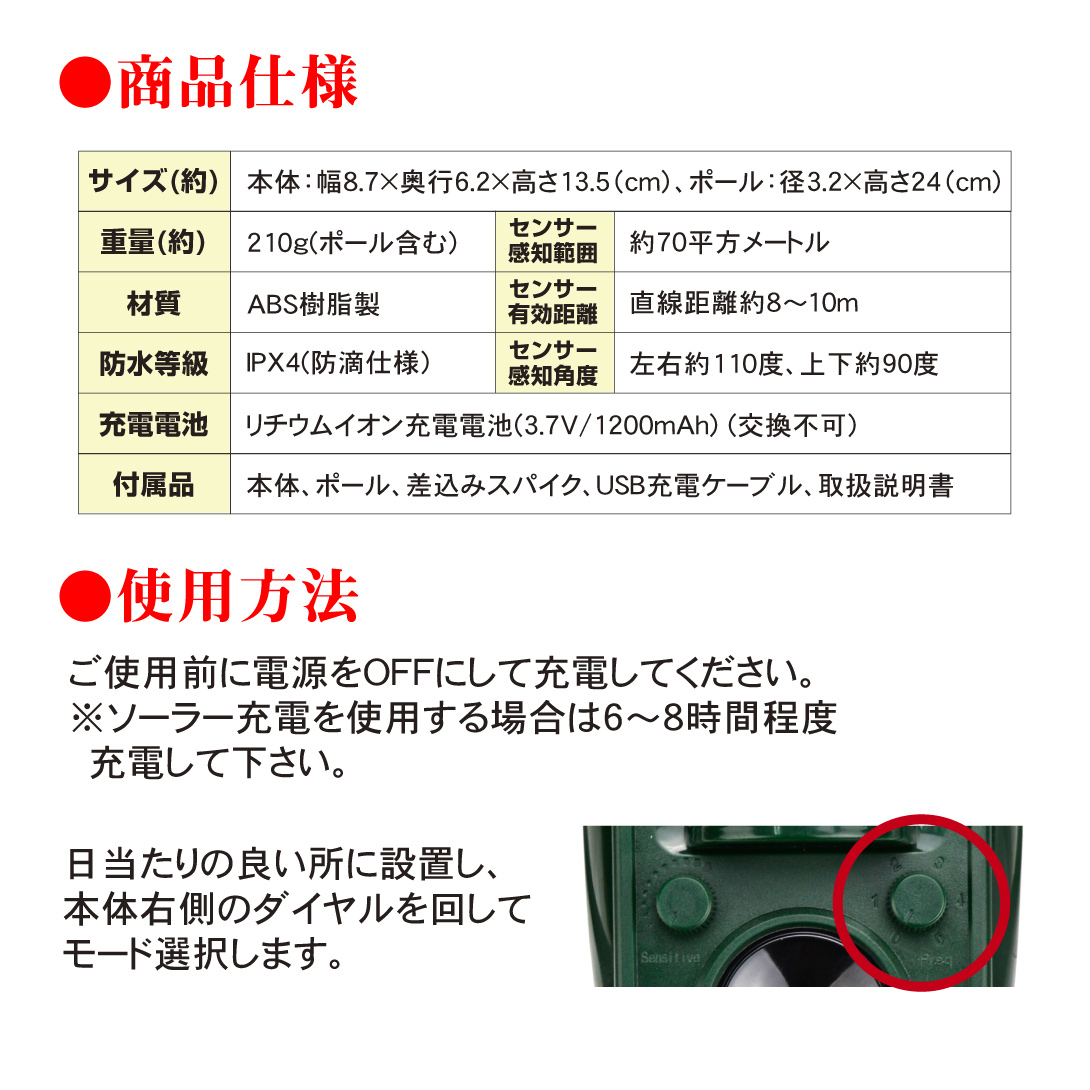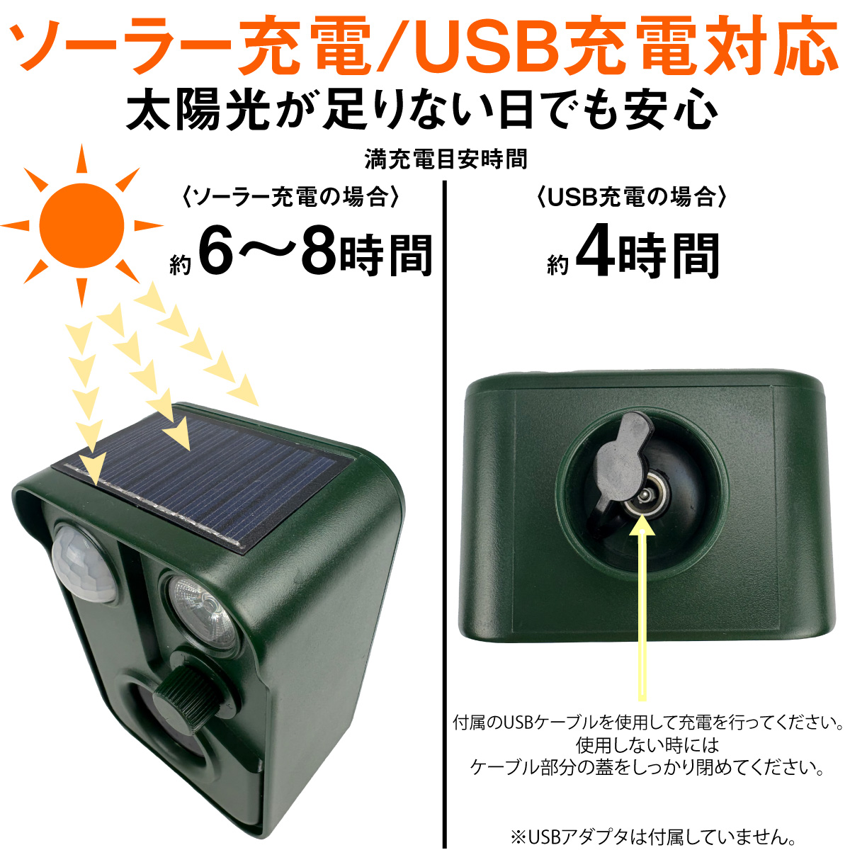 超音波と光とアラーム音で撃退! センサーが上下90度、左右110度、70㎡の範囲、8~10m先まで感知し、超音波(周波数調節可)・ 光で対象動物を近寄らせなくさせます! ソーラー充電とUSBでの充電も可能。防水等級IPX4の簡易防水機能付なので、どこでも気軽に設置できます。背面に引っ掛け穴があるので吊るして使用することも可能です。