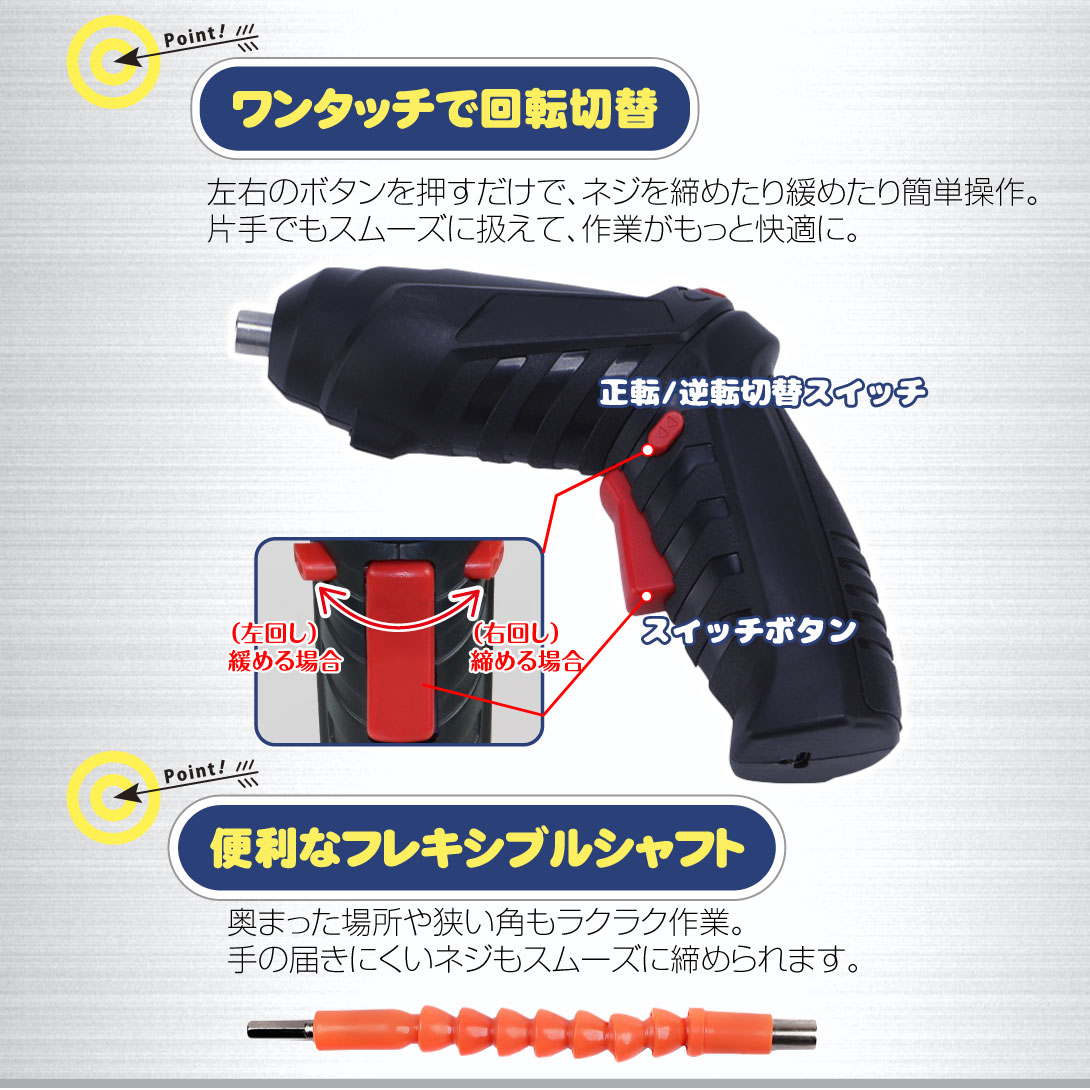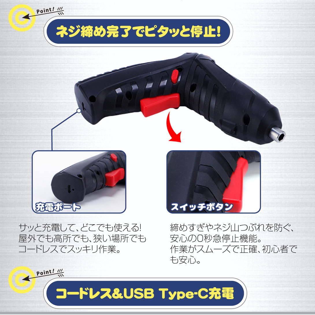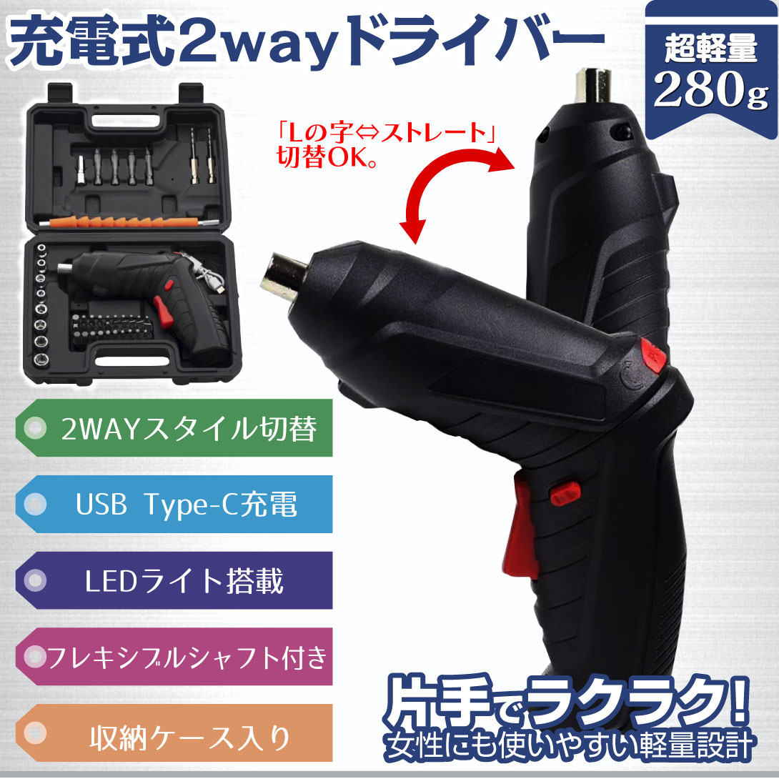 電動ドライバー 小型 充電式 1個 コードレス 超軽量280g 2WAYスタイル USB Type-C充電 LEDライト付き 収納ケース付 DIY