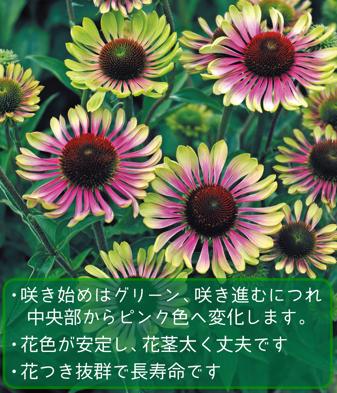 エキナセアはくっきりとした花姿が人気の品種です。観賞期間も長く夏花壇の彩りに重宝されています。また切花やドライフラワーにもでき幅広く楽しめます。