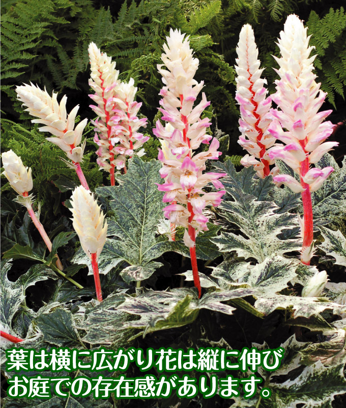 葉の切れ込みと、クリーム色の斑が特徴的な大型宿根草です。初心者でも育てやすい。