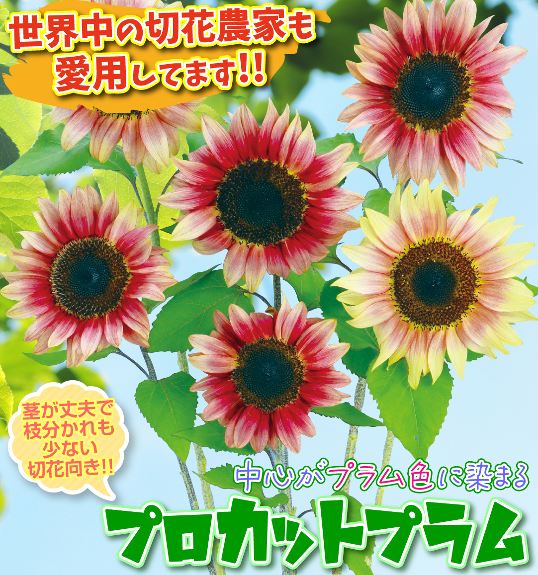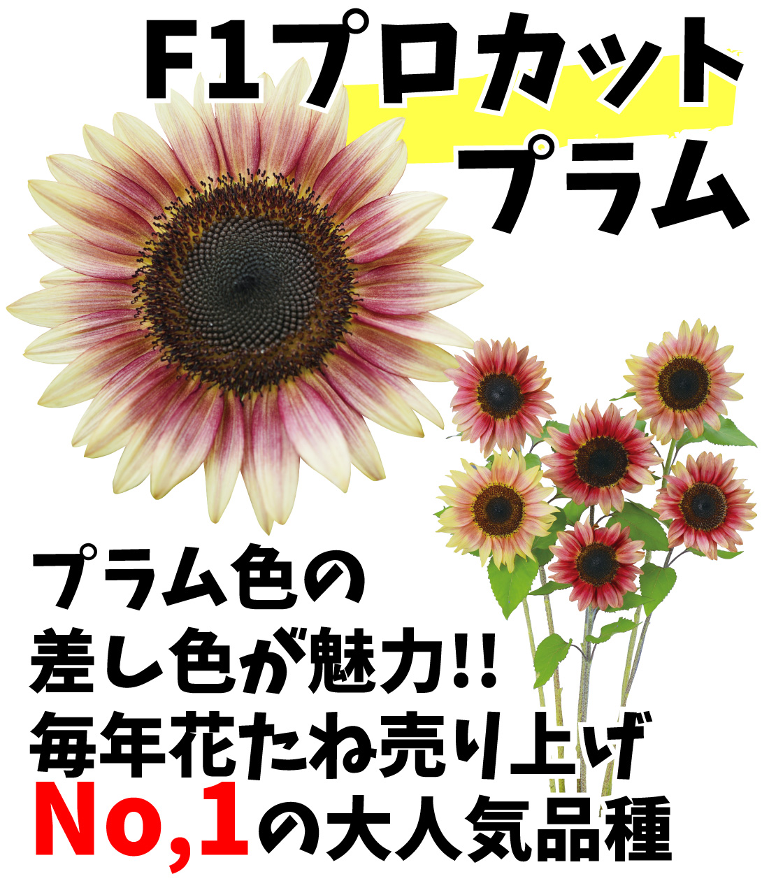 ●商品情報:昨年度ひまわり人気No.1に輝いた期待の新星!プラム色の花弁の先がクリーム色になる2色咲の美麗花です。茎が丈夫で長く、枝分かれもあまりしないので、切花に重宝される「プロカットシリーズ」は切花農家も愛用している優秀品種ばかりです。