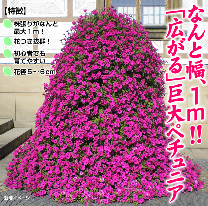 ●商品情報:滝のように溢れんばかりに咲き乱れる姿は圧巻!花壇では絨毯のように広がり、ハンギングでも大型になり見応え抜群!花径5.5~6cmの中輪花。株幅は80~100cm。