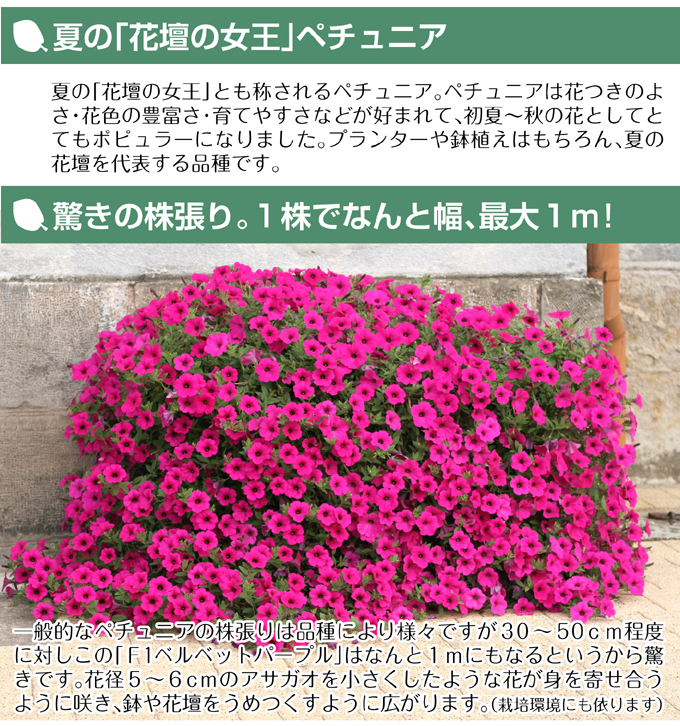 一般的なペチュニアの株張りは品種により様々ですが、30~50cm程度に対し、この「F1ベルベットパープル」はなんと1mにもなるというから驚きです。花径5~6cmのアサガオを小さくしたような花が身を寄せ合うように咲き、鉢や花壇をうめつくすように広がります。(栽培環境にもよります)