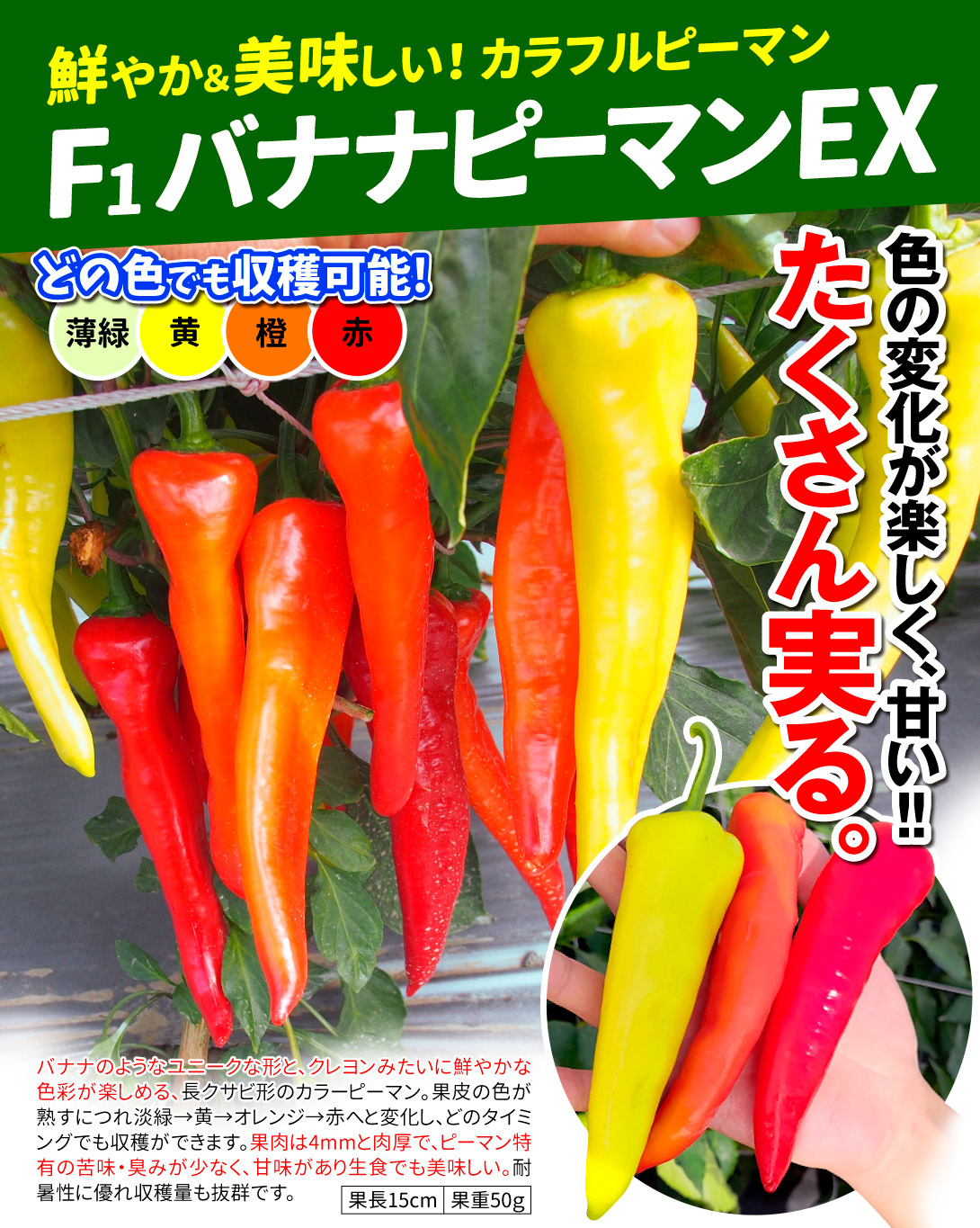 バナナのようなユニークな形と、クレヨンみたいに鮮やかな色彩が楽しめる、長クサビ形のカラーピーマン。果皮の色が熟すにつれ淡緑→黄→オレンジ→赤へと変化し、どのタイミングでも収穫ができます。果肉は4mmと肉厚で、ピーマン特有の苦味・臭みが少なく、甘味があり生食でも美味しい。耐暑性に優れ収穫量も抜群です。 |