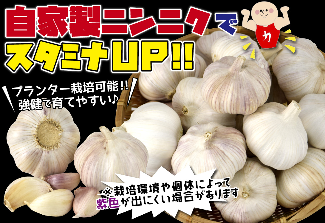表面の薄皮が紫色になり美しい!皮をむくと従来のニンニクと同じく白色をしています。味・香りが良く、料理の香り付けなどに最適です。強健で育てやすく、最大直径7cm以上になる大玉品種で収量も多い。