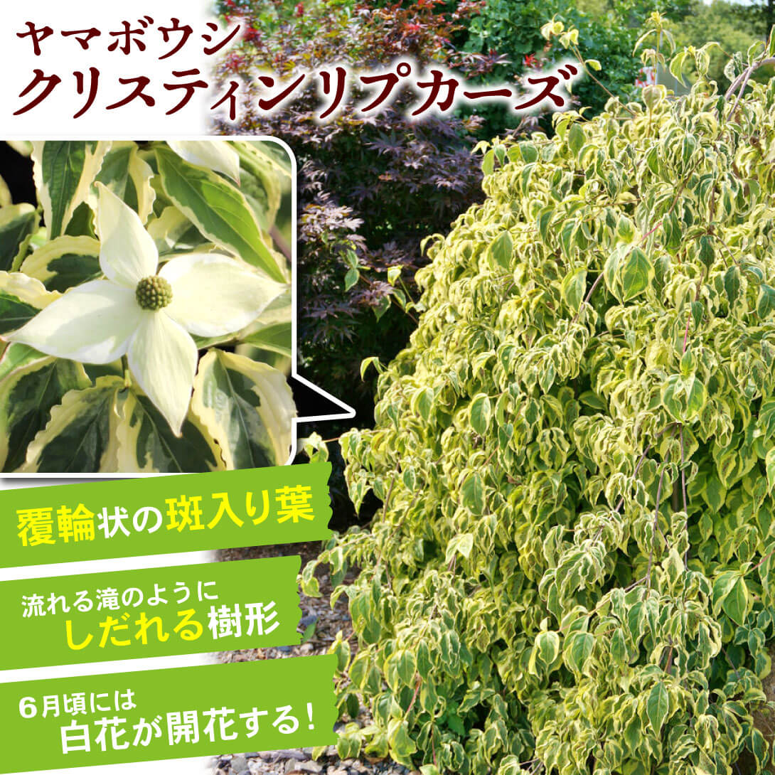 クリスティンリプカーズは、流れる滝のようにしだれる樹形に覆輪状の斑入り葉が特徴のヤマボウシです。