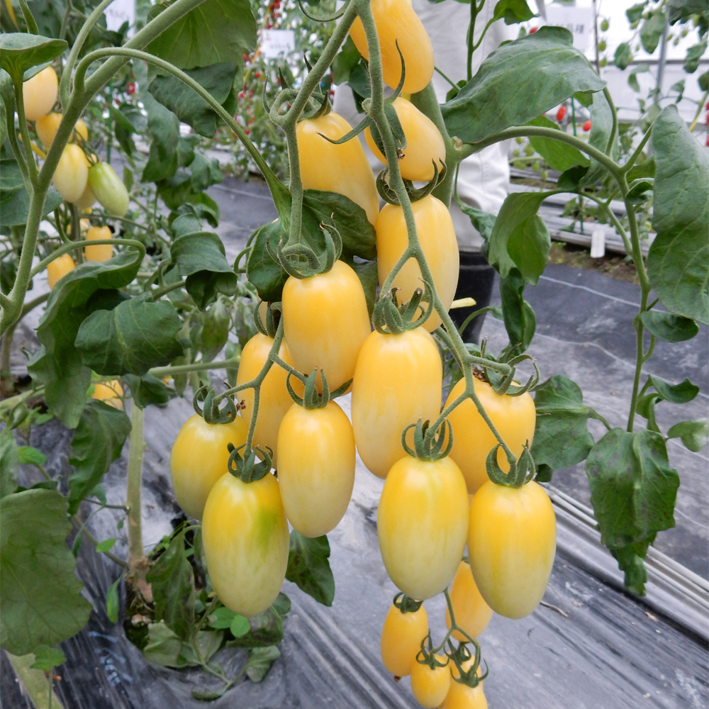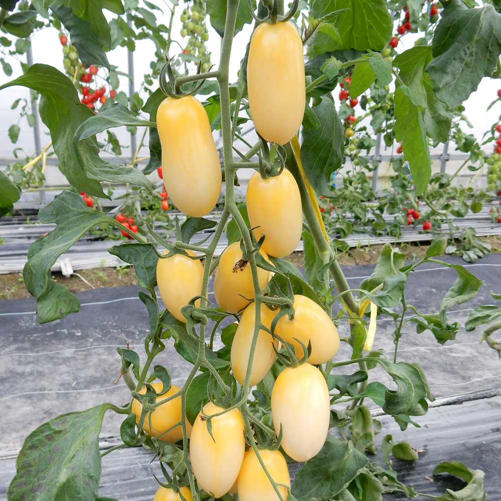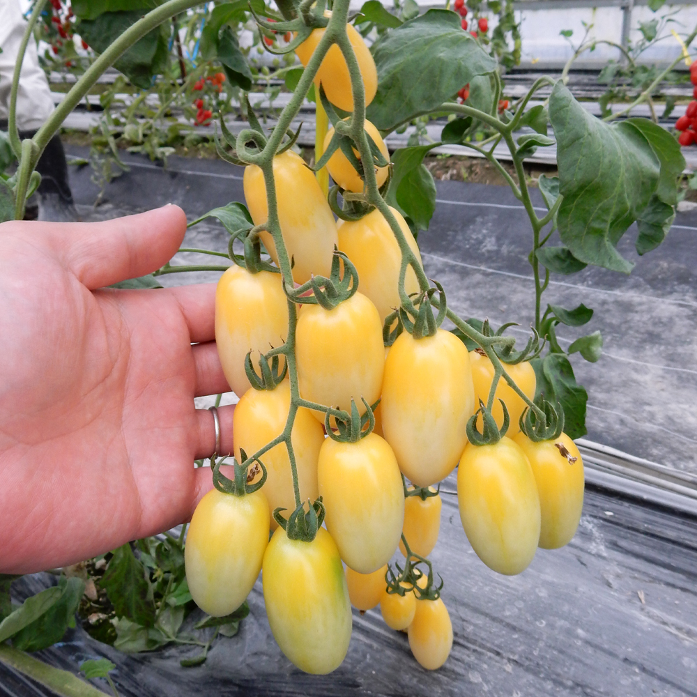 白皮が目を惹く極上のミニトマト! やや大きめの実は旨さと食べ応えを兼ね備え、酸味をほぼ感じない極上の甘味が舌を楽しませてくれます。試食スタッフは「こんなに美味しいなんて…!」とびっくり。糖度10度前後、花数が非常に多く収量性に優れ、複合耐病性を持つので育てやすい!