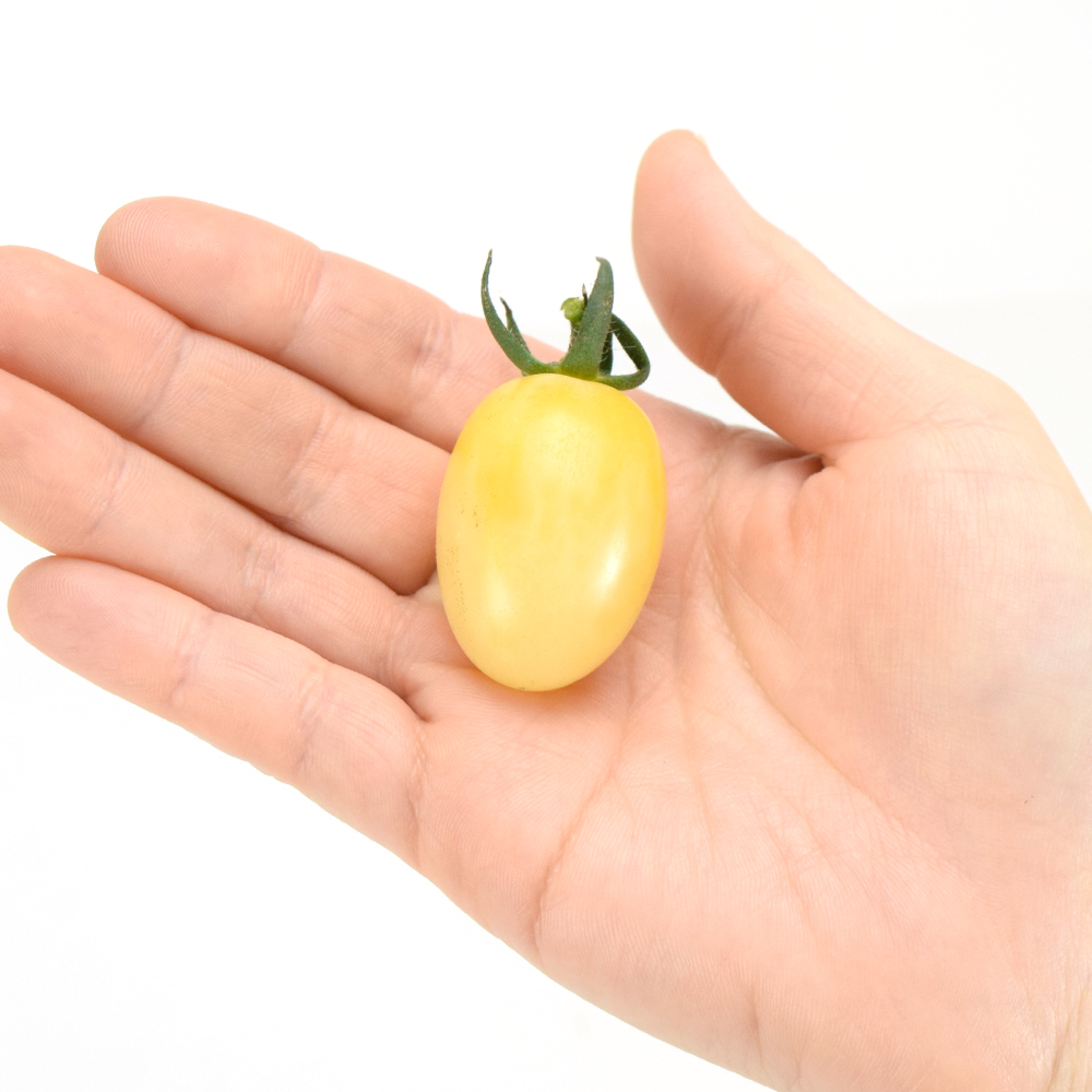 白皮が目を惹く極上のミニトマト! やや大きめの実は旨さと食べ応えを兼ね備え、酸味をほぼ感じない極上の甘味が舌を楽しませてくれます。 試食スタッフは「こんなに美味しいなんて…!」とびっくり。糖度10度前後、花数が非常に多く収量性に優れ、複合耐病性を持つので育てやすい! |