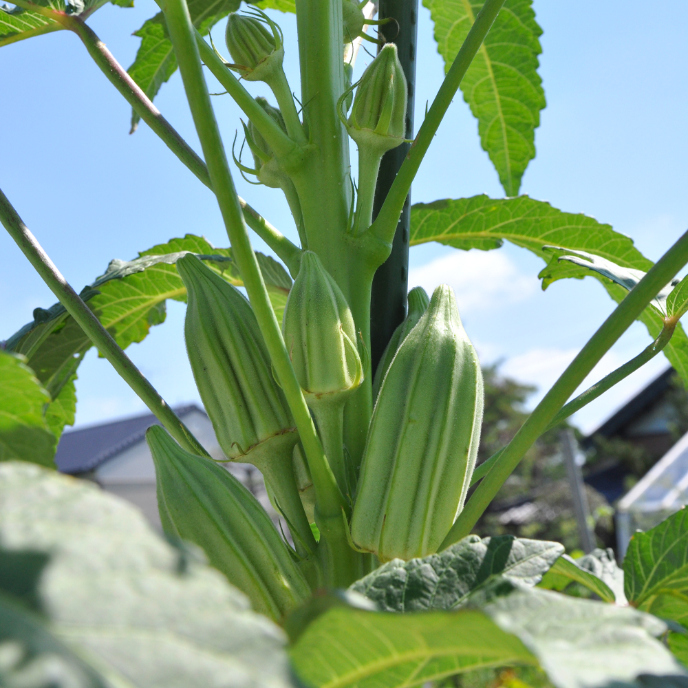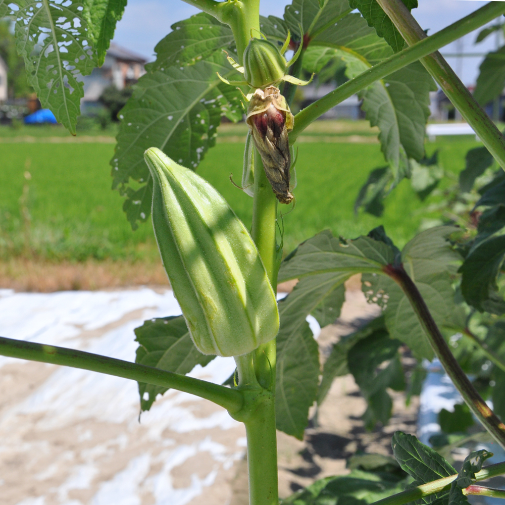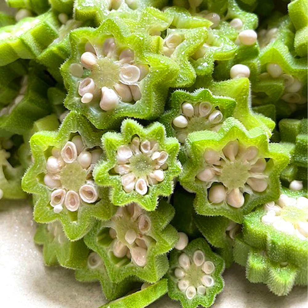通常のオクラと比べると、短く太い果実が特徴的!小さくてもしっかりと粘り気があり、切り口が星形のようになります。果長7~8cmが収穫適期の可愛らしいサイズのオクラです。