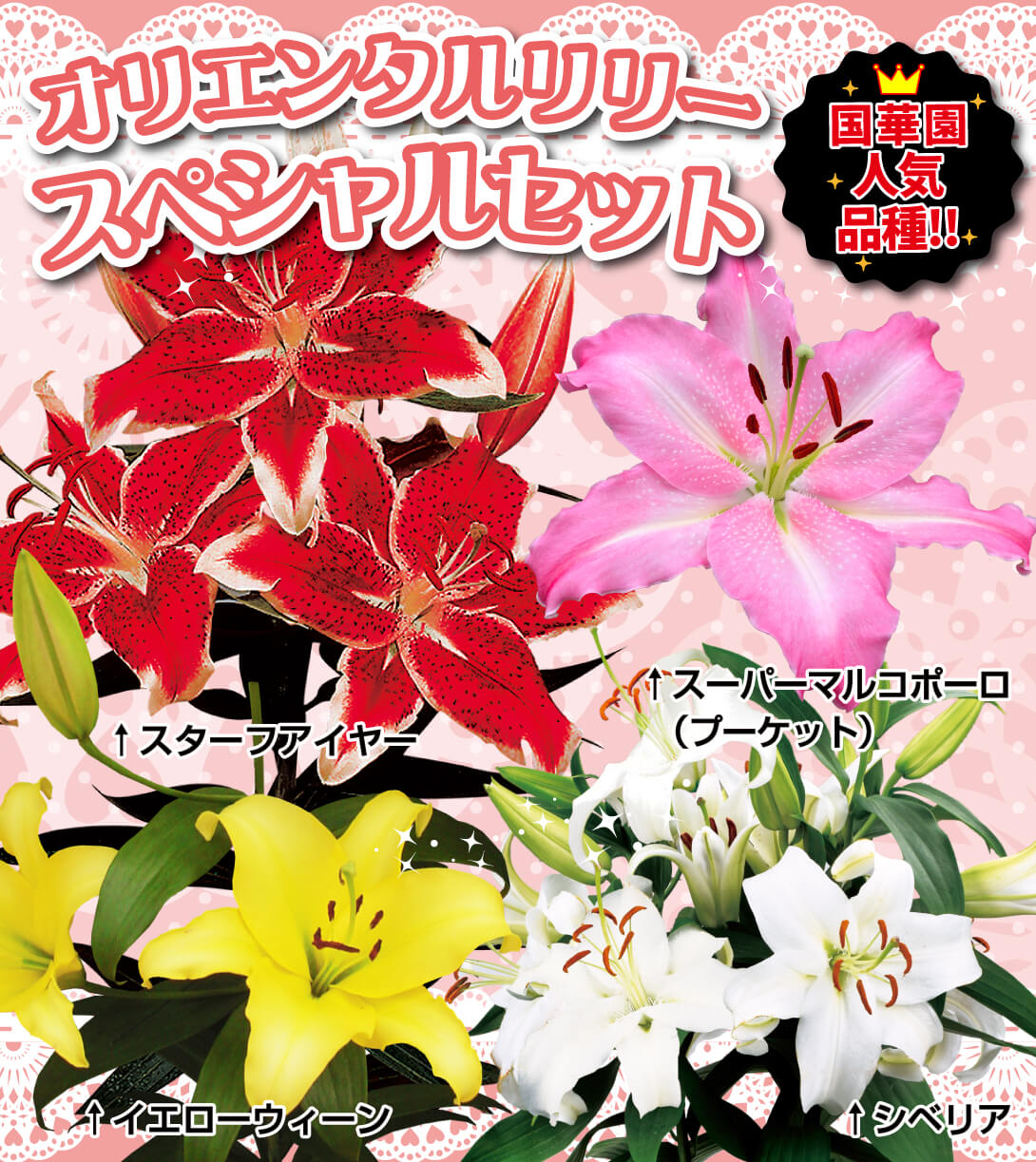国華園厳選のオリエンタルリリー4品種を集めたお買得セット。花は良い香りがします。