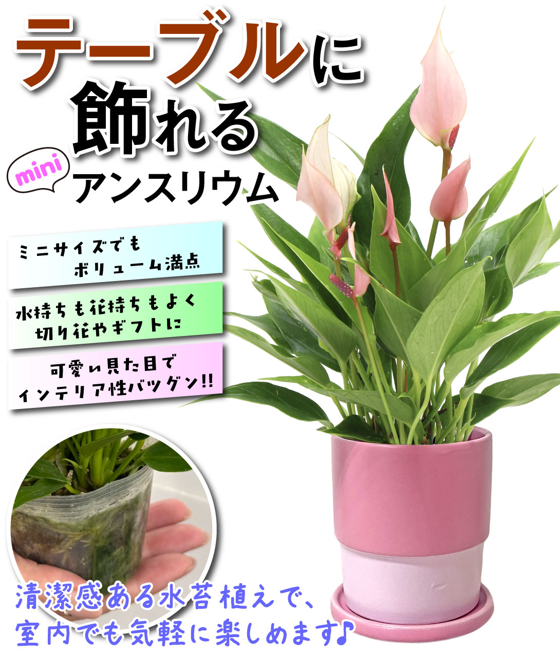 ●商品情報:テーブルにも飾れるミニサイズのアンスリウム。ミニサイズでも株のボリュームは満点!!土を使用せず、水苔に植え付けており、水持ち抜群で清潔感があります。見た目にも可愛い花で、水持ちも良いので切花や、ギフトとしてプレゼントにも。