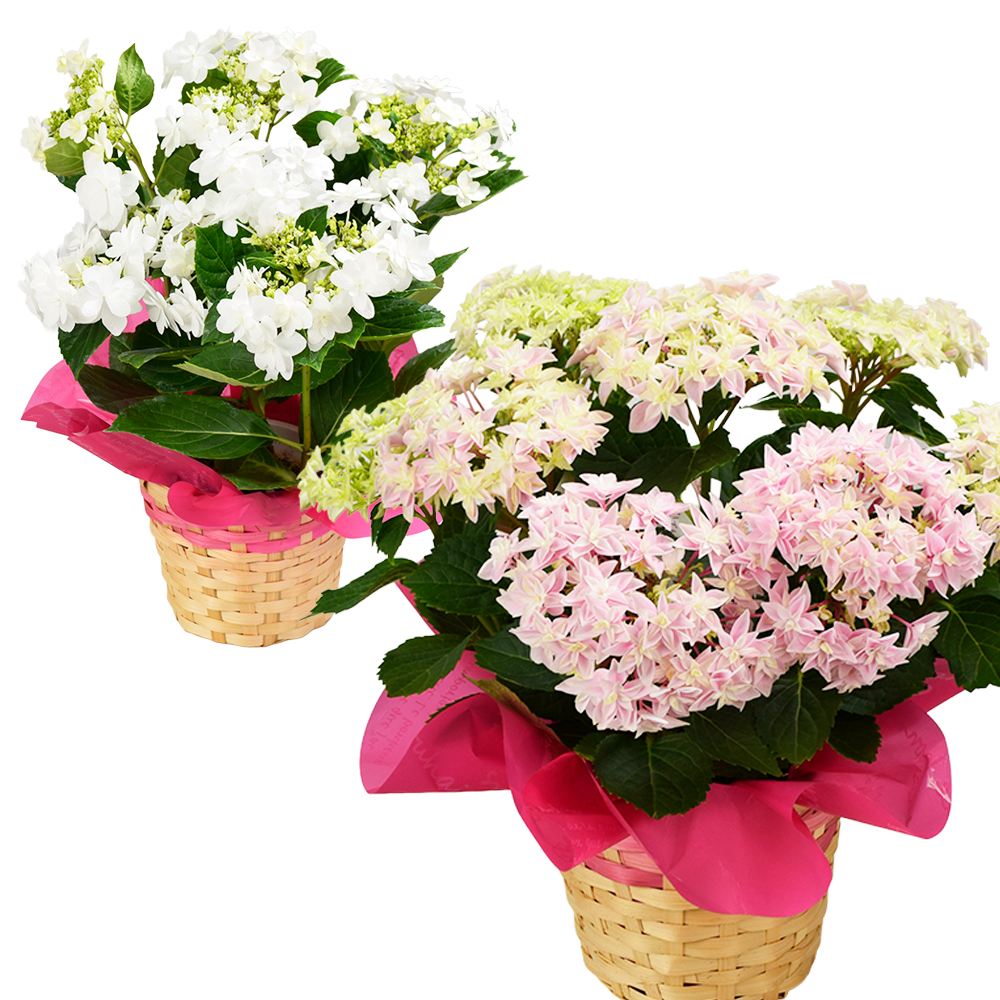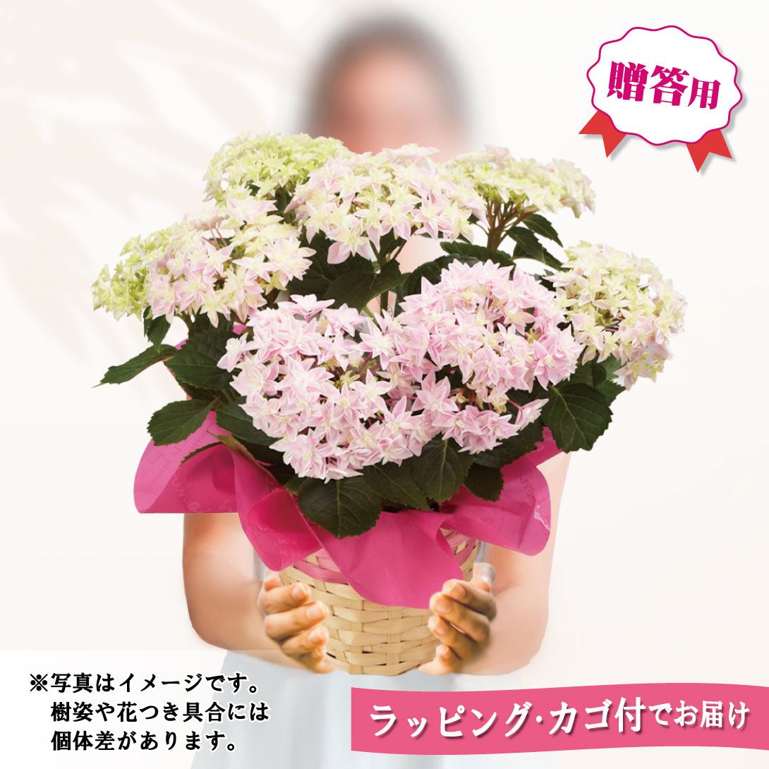 華やかで豪華な贈答用にも喜ばれるアジサイの鉢花を、ラッピング・カゴ付でお届け! 白から桃系の優しい花色から選んでお届けします。