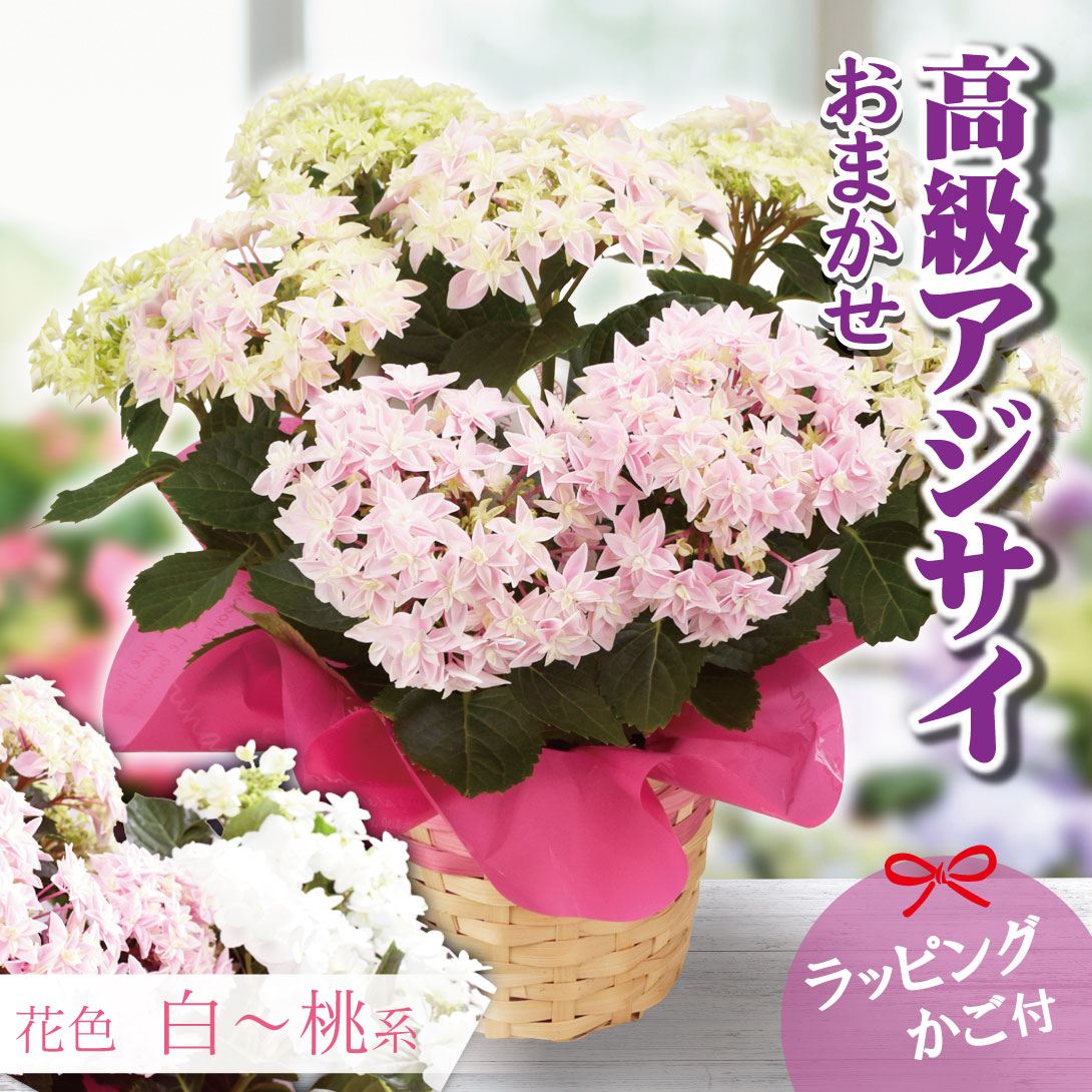 花木苗 アジサイ 鉢花 高級紫陽花おまかせ 白~桃系 ラッピング・カゴ付 1鉢 開花株 送料込み