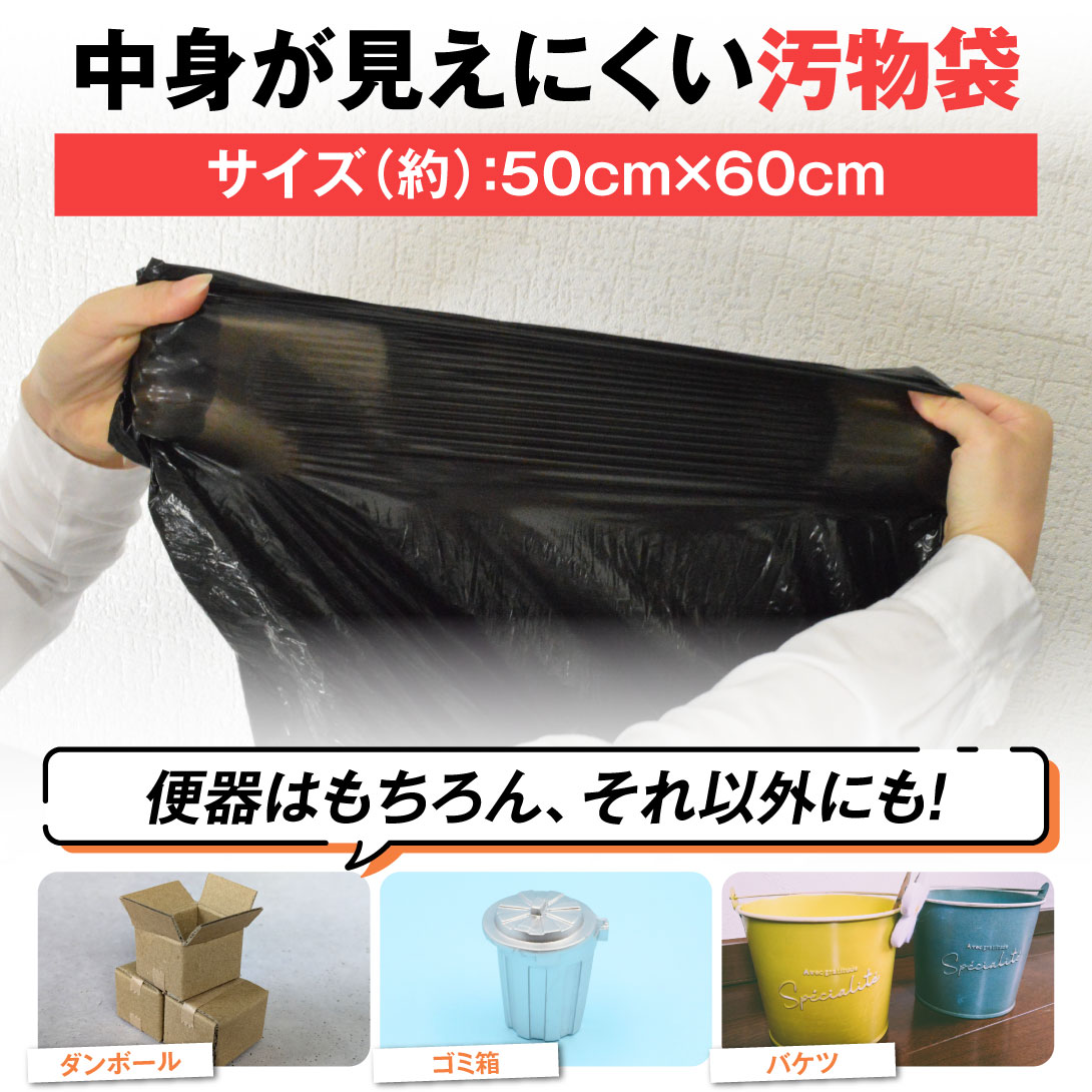 汚物袋見えにくい色、使いやすいサイズ。便器に被せて使うのはもちろん、ダンボールやゴミ箱、バケツなどに被せてトイレ代わりとしてもOK。