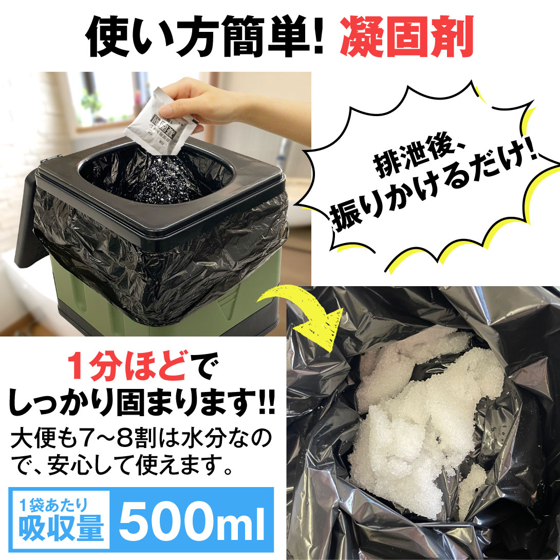凝固剤の使い方はとっても簡単!排泄後、凝固剤を振りかるだけ。1分ほどでしっかり固まります。また、大便も7~8割は水分。小便のみではなく、大便でも安心して使用できます。