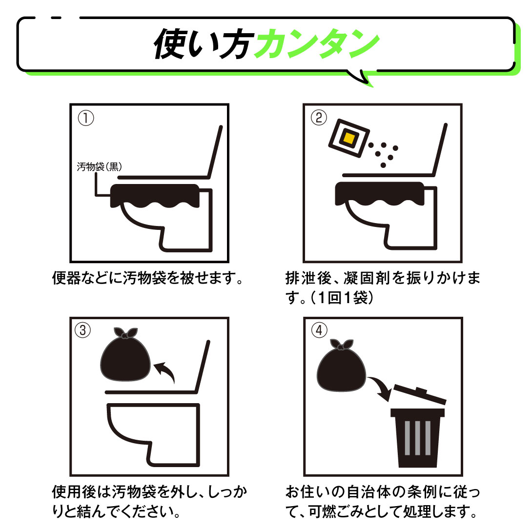 便器などに汚物袋を被せて、排泄。そのあとに凝固剤を振りかけ、固まったのを確認。使用後はしっかりと袋を締め、自治体の条例にしたがって可燃ゴミへ。