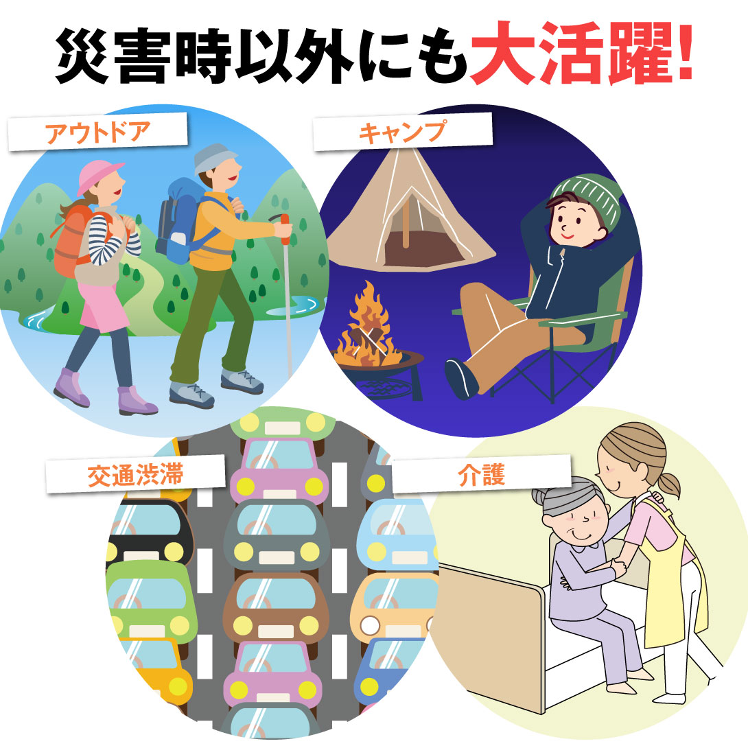 非常用トイレは災害時以外にも大活躍。キャンプなどのアウトドア、交通渋滞に巻き込まれたとき、介護など様々な場面で使用可能。
