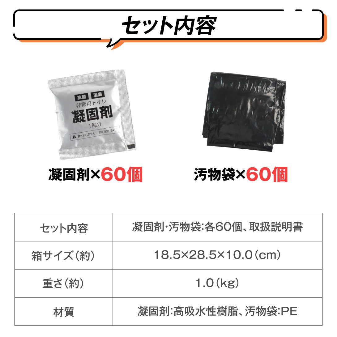 凝固剤(高吸水性樹脂)60袋、汚物袋60枚、取扱説明書