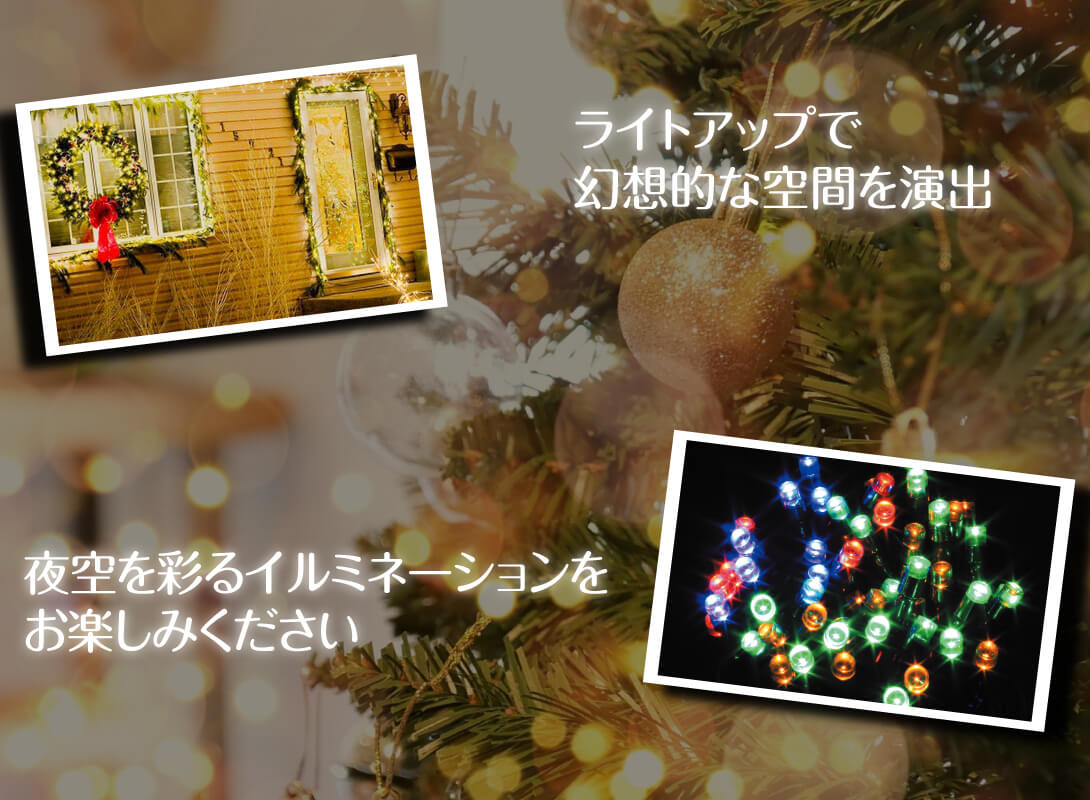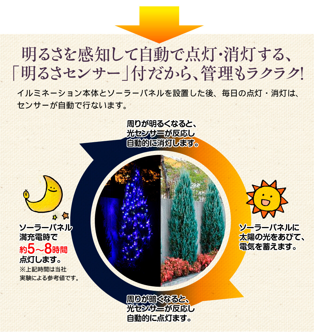 ソーラー充電式だから電気代0円でイルミネーションを楽しめます。