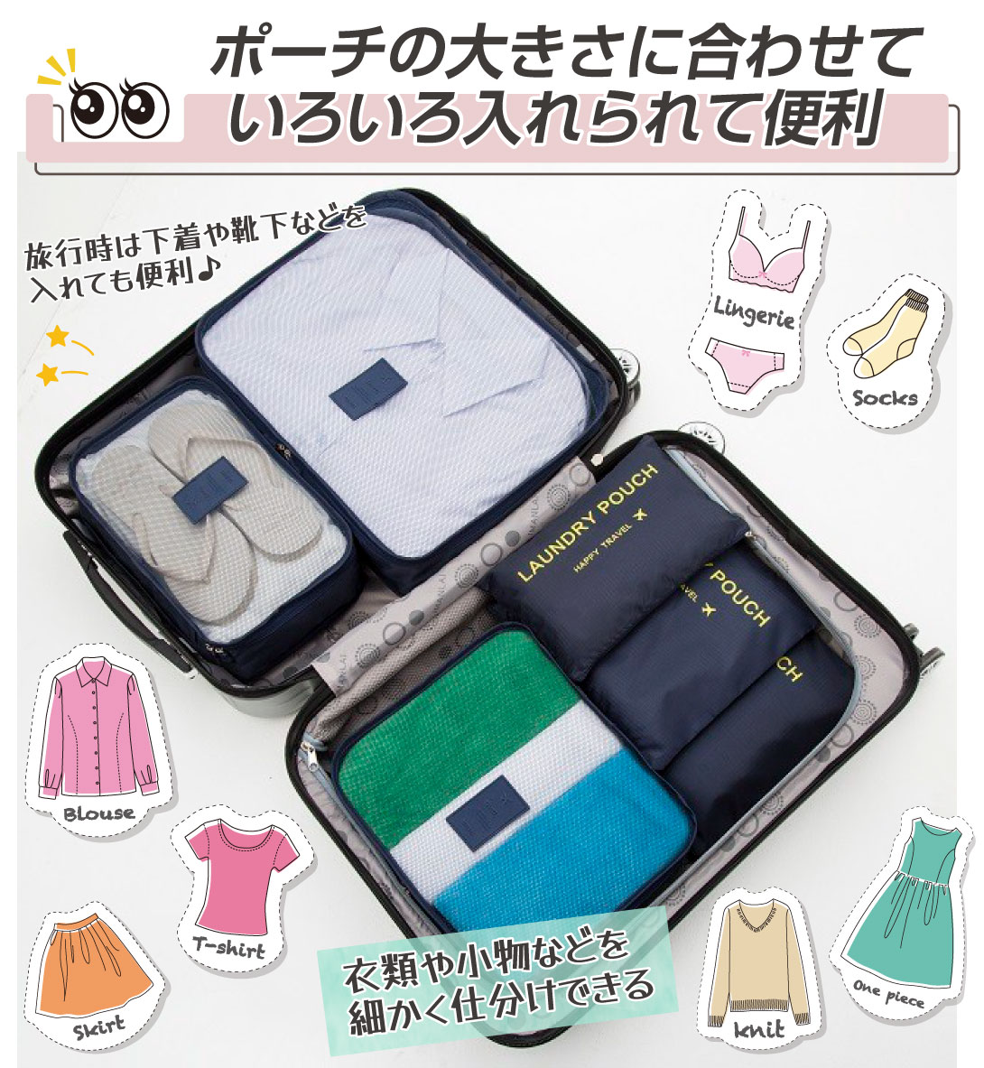 旅行や出張に役立つ多収納ポーチ! 男女兼用で使えるシンプルなデザイン! 旅行、出張、子供連れのお出かけ、事務や学校行事のお泊りなど様々なシーンで活躍します。 押し入れの整理整頓にもおすすめ! 【サイズ】 収納バッグL約:37×27×10(cm) 収納バッグM約:29×22×10(cm) 収納バッグS約:19×15×10(cm) 収納ポーチL約:29×20(cm) 収納ポーチM約:25×18(cm) 収納ポーチS約:17×13(cm) ●商品仕様:6点セット ●素材:ポリエステル製 ●備考: ※ディスプレイ画面上等の環境上、写真と実際の商品の色とは多少違う場合がございます。