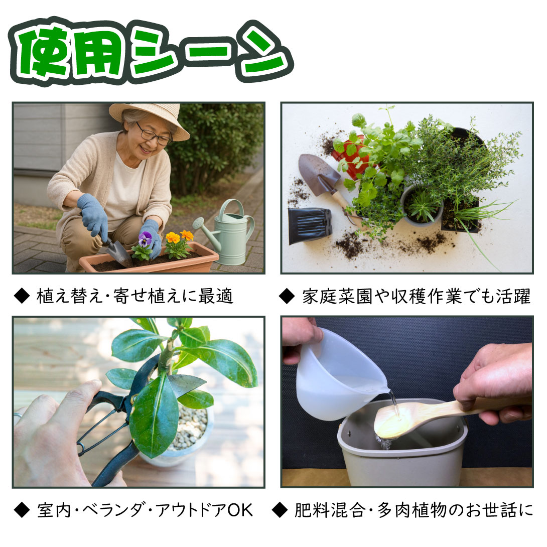 強化ハンドル付きで土を入れたままでも運びやすく、後片付けもラクラク。