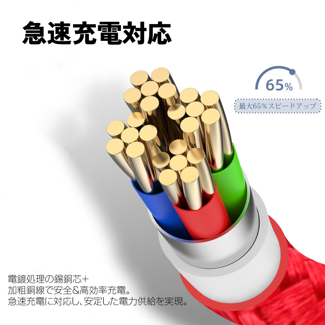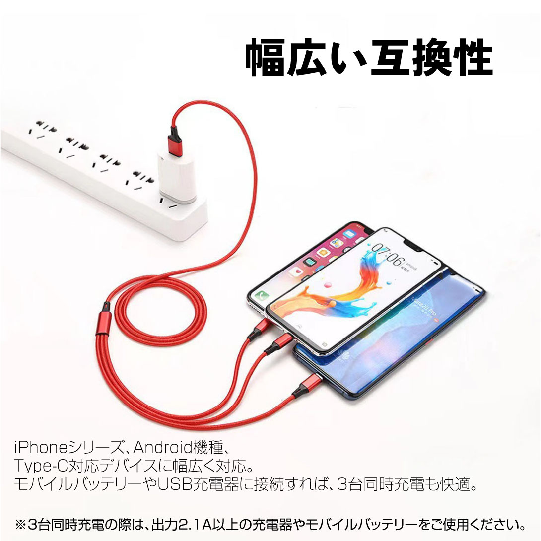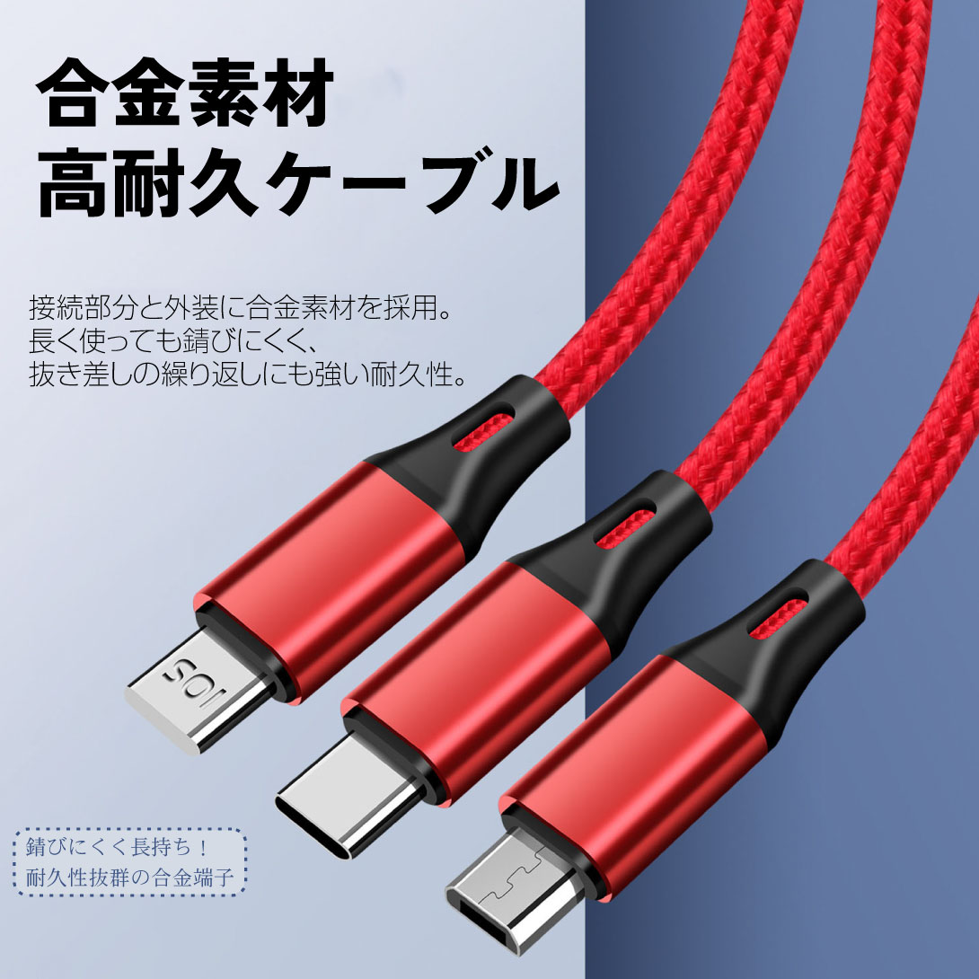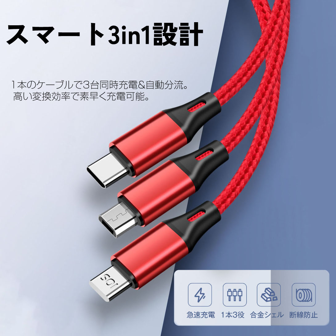 3in1 充電ケーブル 1個 1.2m 急速充電対応 Lightning MicroUSB Type-C iPhone Android 多機種対応 ナイロン編み