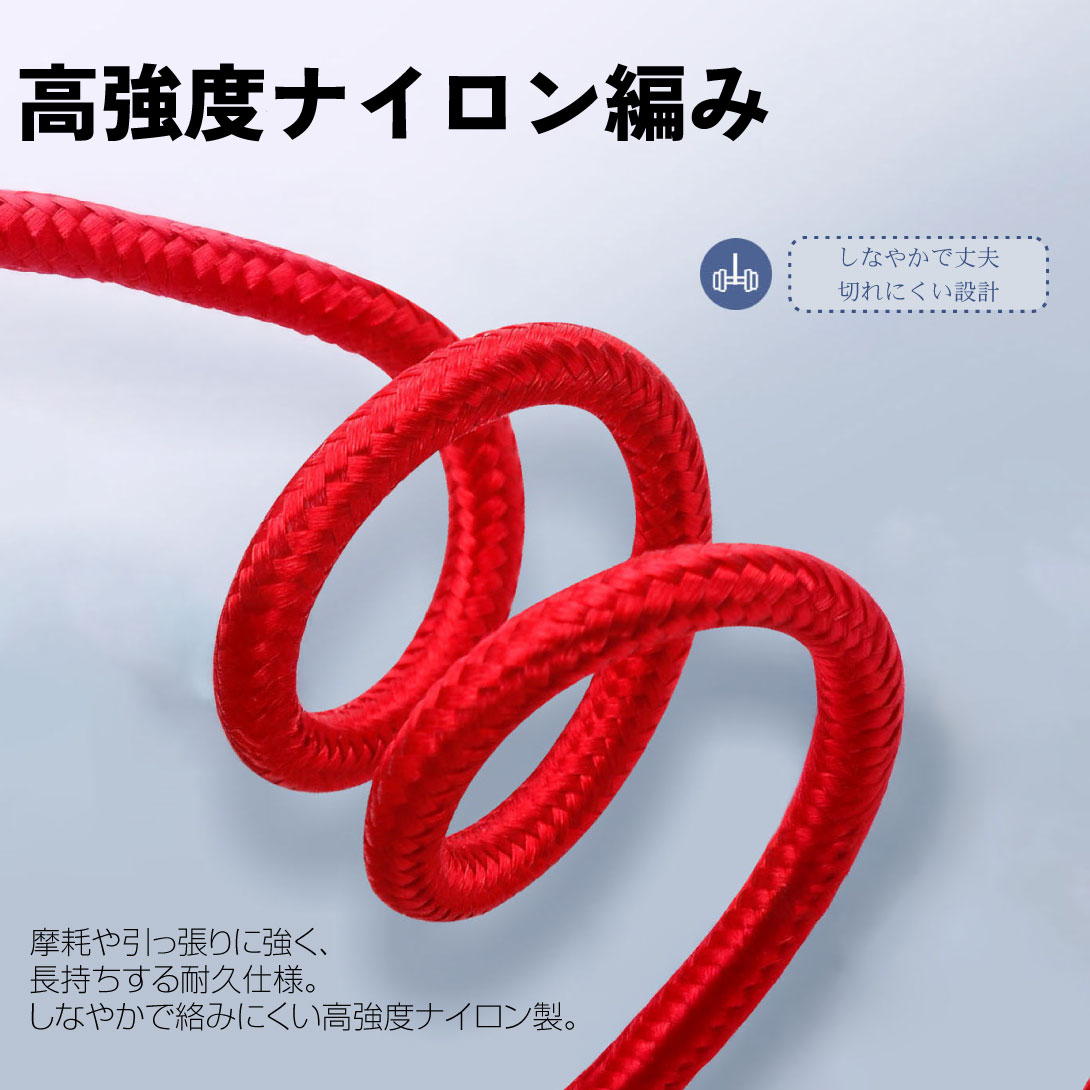 さらに、合金コネクタ + 高耐久ナイロン編組素材を採用。断線しにくく長持ちで、日常使いや旅行・出張にも最適です。