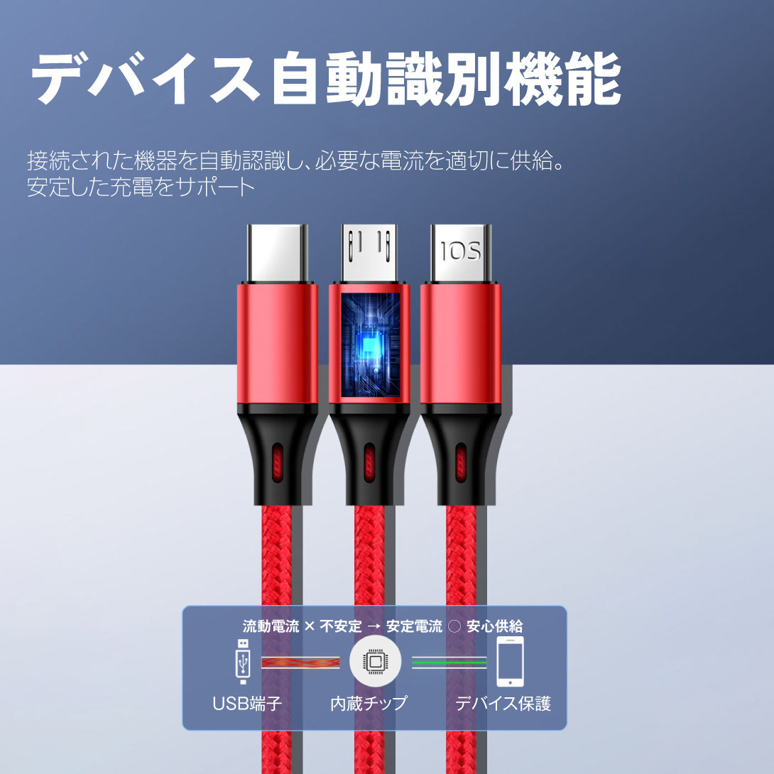 Lightning / MicroUSB / Type-C の3種類の端子に対応し、これ1本で幅広い機器を充電できます。