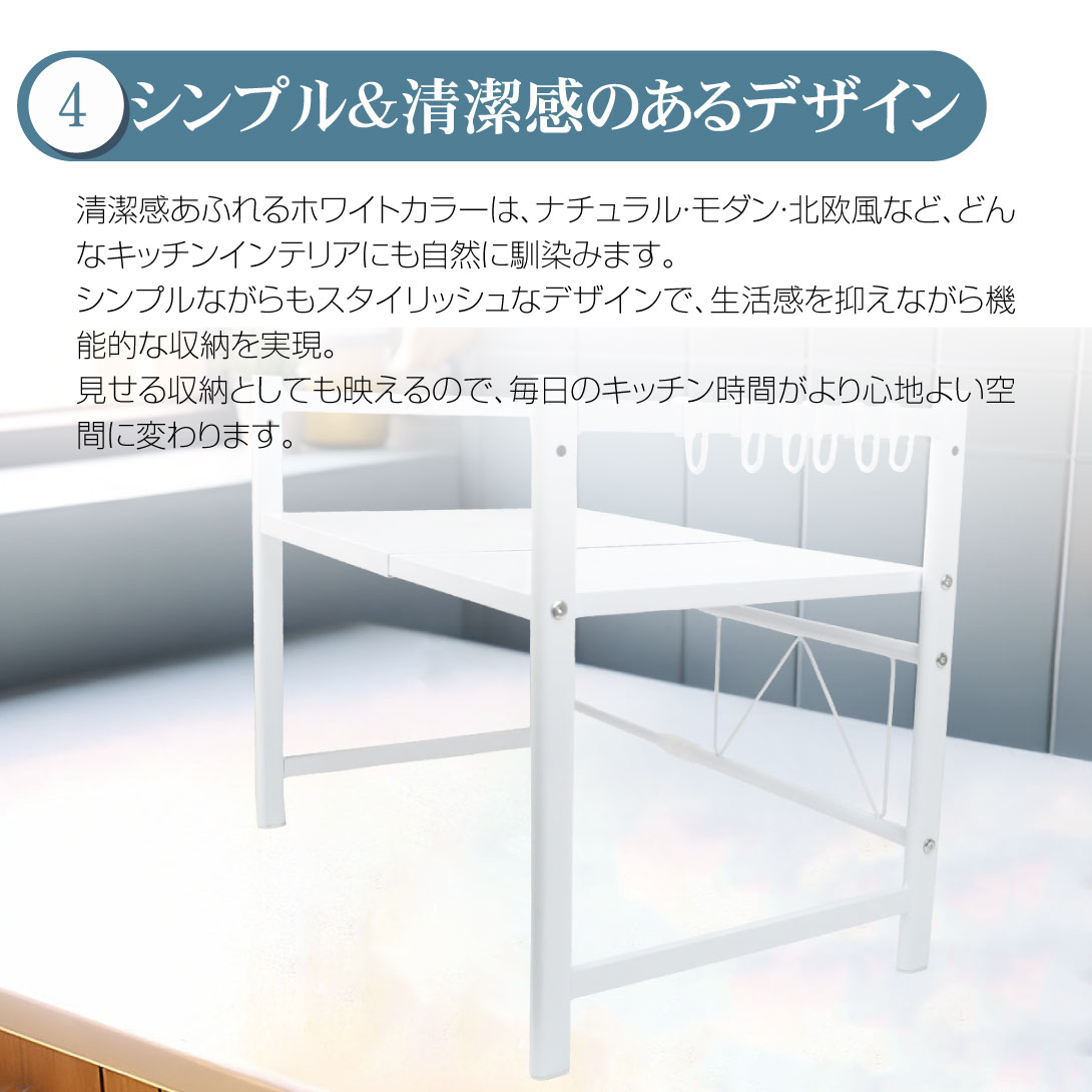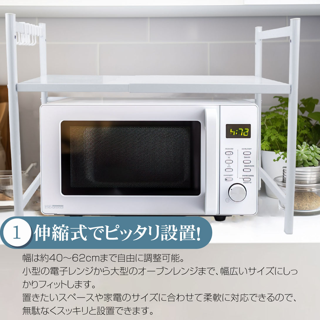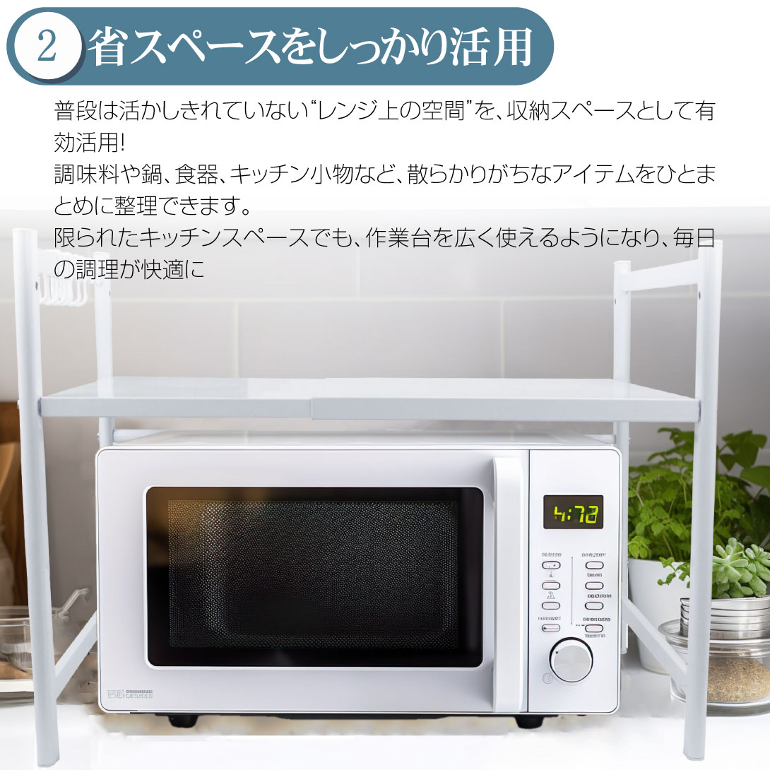 幅調整可電子レンジやオーブンの上に置くだけで、調味料や調理器具、小物などをすっきりと収納。