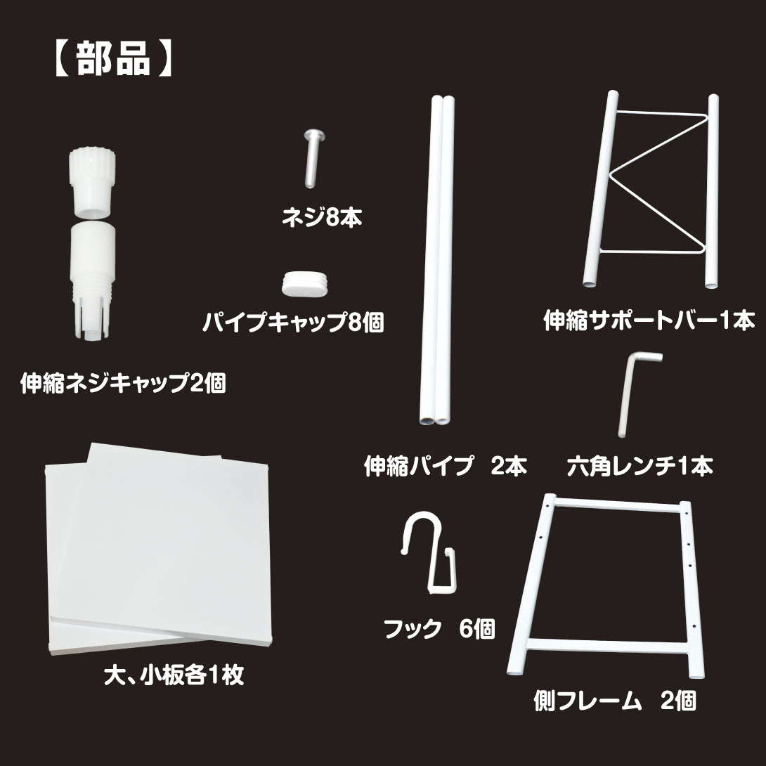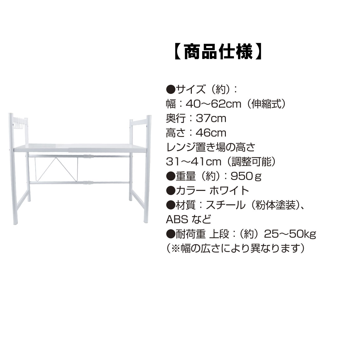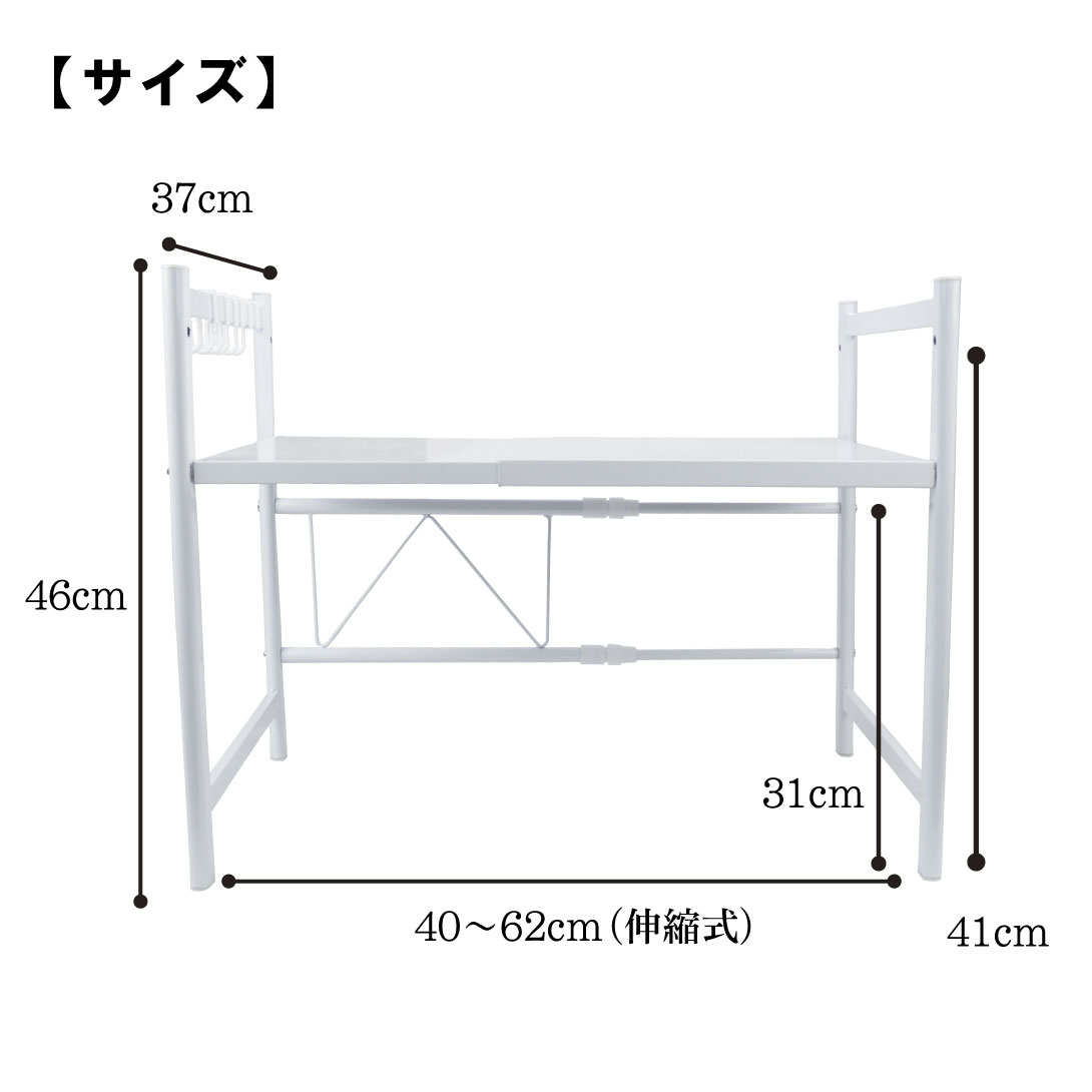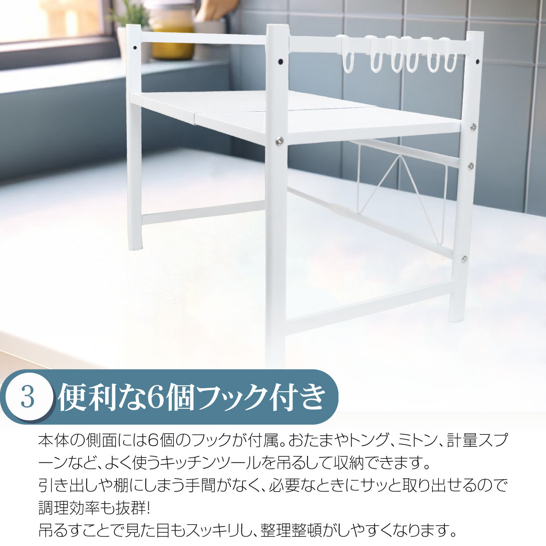 伸縮式レンジ上ラック 1個 単層 フック6個付き 電子レンジラック キッチン収納 ホワイト 多機能 組立簡単 幅調整可