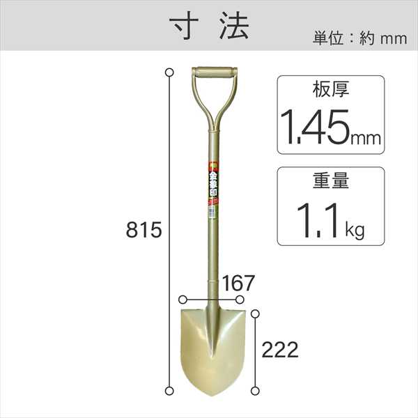土木、造園、家庭園芸など幅広く使用いただけます。頭部はショベル鋼板S50C相当を使用し、焼入れ(強度が上がる、摩耗に強くなる)、焼戻し(弾性力が上がる)の熱処理を行っています。軽量かつコンパクトで扱いやすいサイズ感です。