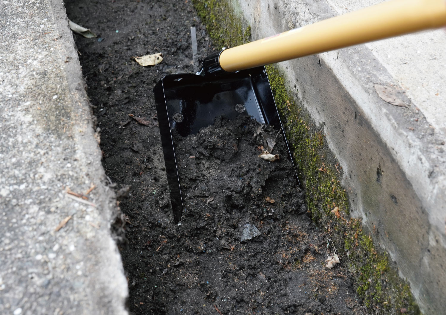 溝の清掃作業。泥すくい作業に。小型で軽量なので狭い場所での使用に便利。水抜き穴を採用しています。
