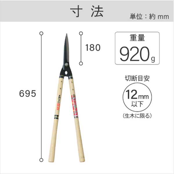 枝葉、生垣の刈込作業に。刃部に安来鋼を使用。熱処理を施していますので耐摩耗性に優れ、鋼の芯までしっかりを硬度が入っているため切れ味が良く長切れします。ヤニ、シブ取り用に裏スキ仕上げ。柄は樫材を使用していますので丈夫で手にも良くなじみ、絞り柄を採用し全体的にスリムでスマートな仕上げです。刃研ぎ可能な複合材を使用しています。