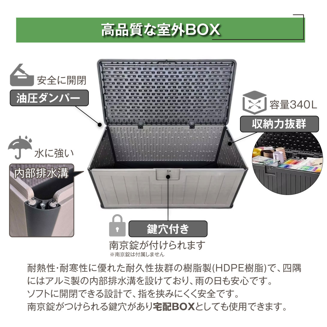 防滴仕様、内部排水溝、油圧ダンパーで開閉がらくらく、排水穴付き、ロック穴付きで宅配ボックスとしても使えます。