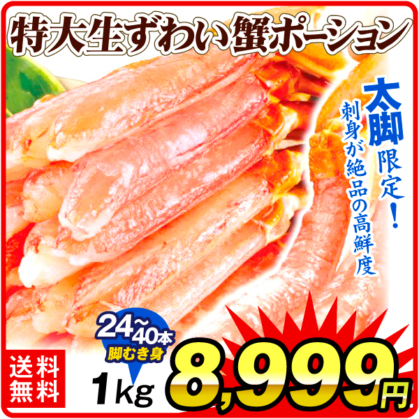 かに 特大 生ずわいがに ポーション 1kg (500g×2パック)脚むき身 生食用 5L 本ずわい 数量限定 お刺身 脚肉のみ 蟹 棒肉 送料無料 食品 冷凍便
