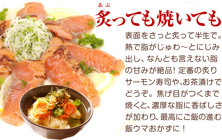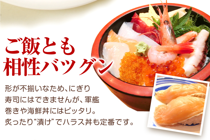 解凍後は生でも食べられる、アトランティックサーモンはらすの切り落としです。脂がのってトロトロのくちどけで、刺身で食べても、炙りやムニエルでも絶品です!
