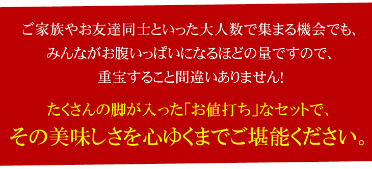 そのまま食べても、鍋や焼き、かに雑炊にしても美味♪ご家族やお友達が集まる機会でも、みんながお腹いっぱいになるほど、たっぷり脚が入った超オススメセットです。