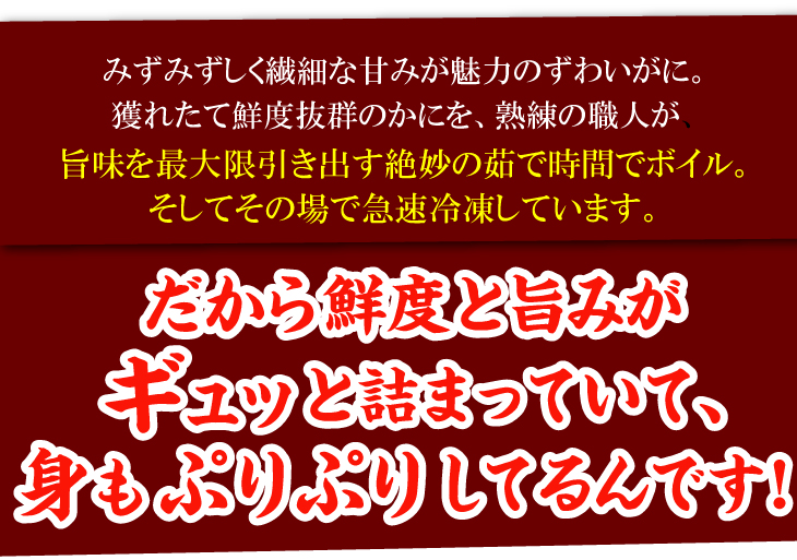 みずみずしく深い甘味が魅力的なずわいがにの脚を、絶妙な塩加減で鮮度を保ったままボイル!